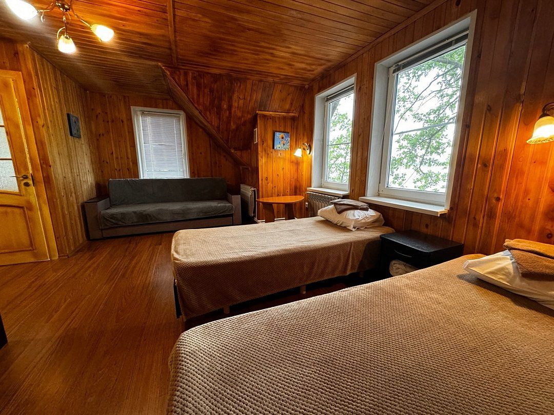 В домике комфортно размещаются 2 взрослых + 2 маленьких ребенка или три взрослых, допускается размещение до 4-х взрослых.