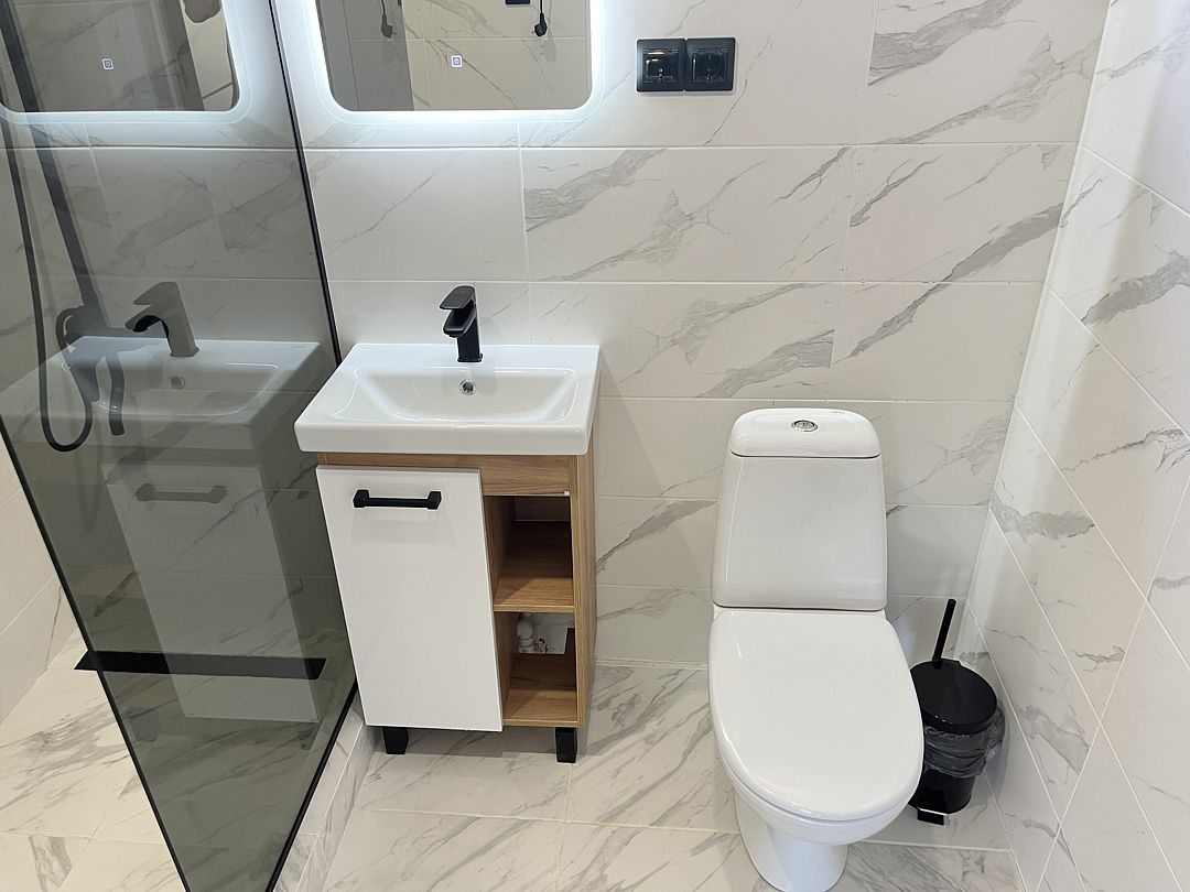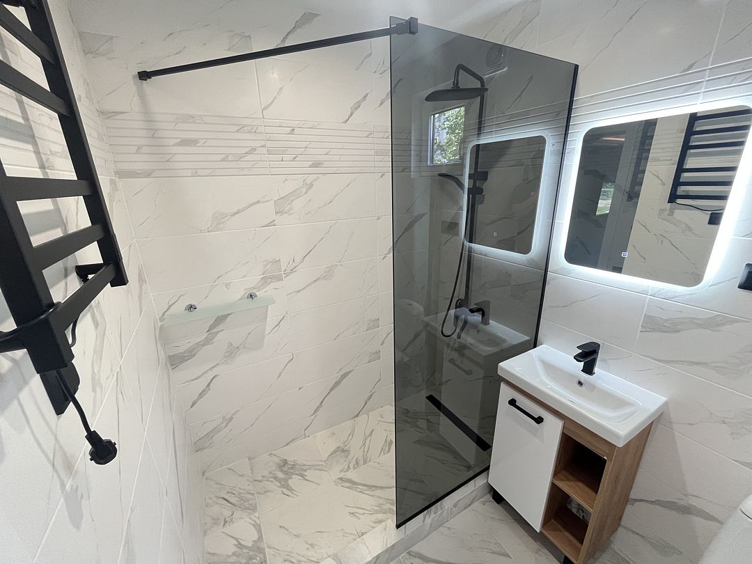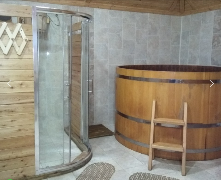 Русская парная в домике рассчитана на компанию до 8 человек. В купели вода подогревается, предусмотрена функция аэромассажа. В душевой кабине — гидромассажная панель и обливное устройство.
