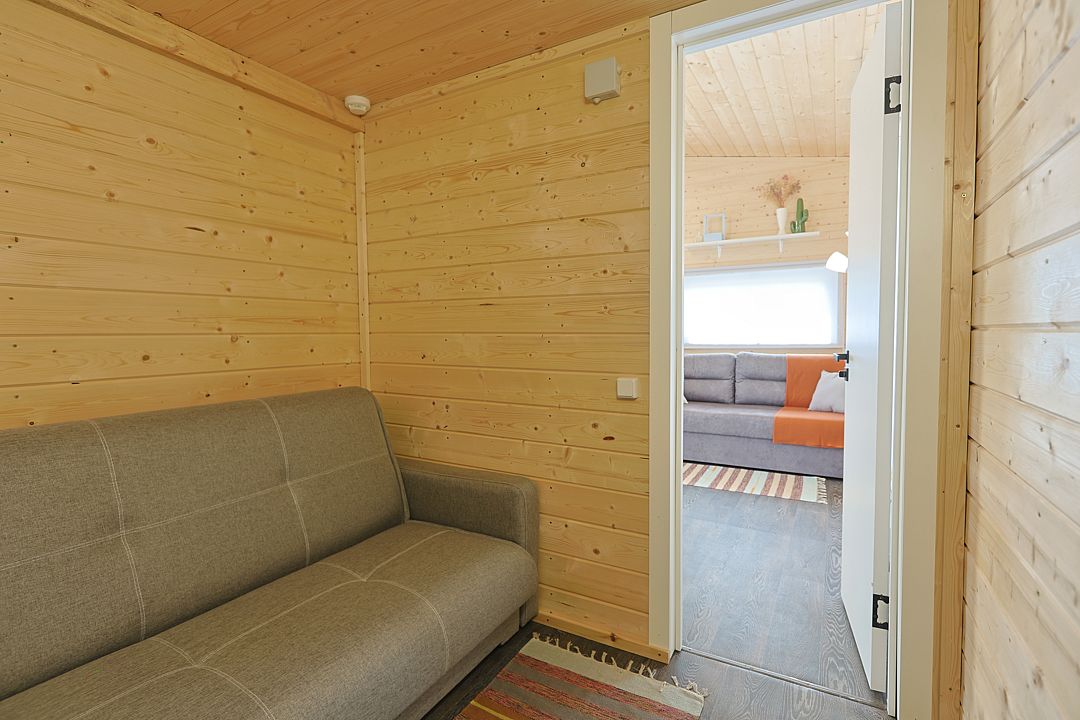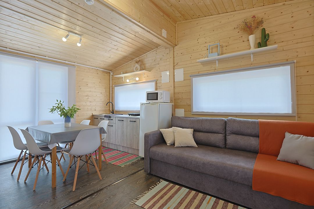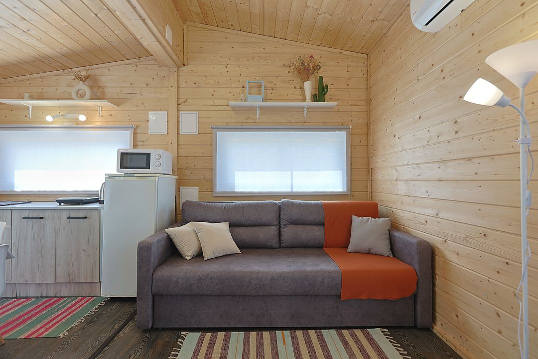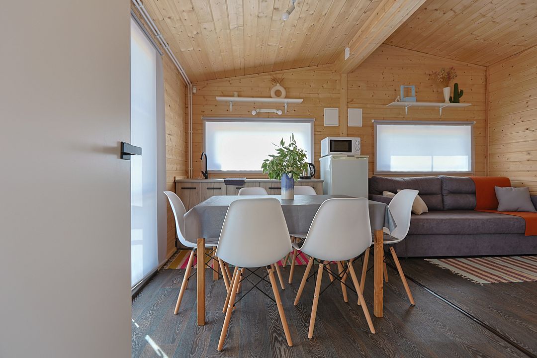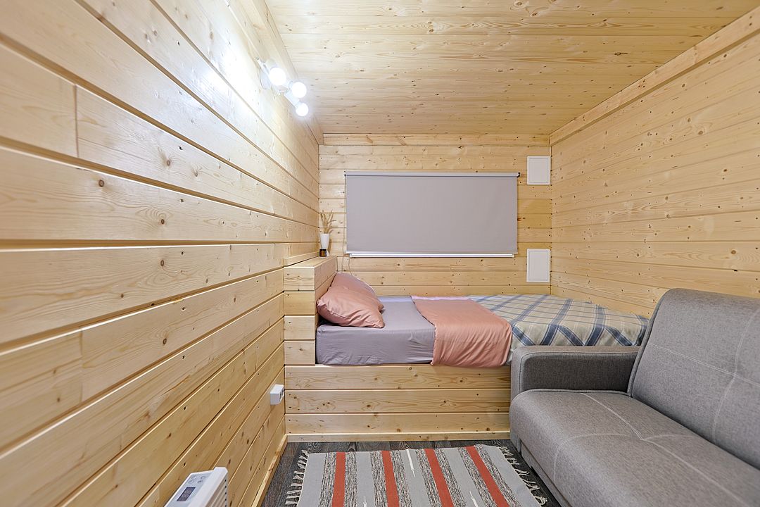 Внутри созданы все условия для комфортного проживания. Кухня оборудована плитой, холодильником, микроволновкой, предоставлена вся необходимая посуда. Поддерживать оптимальную температуру в любое время года помогает сплит-система, а горячая вода доступна круглосуточно благодаря бойлеру. Санузел с душевой кабиной и сауной.