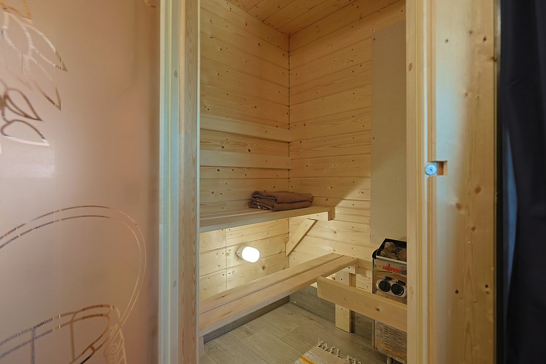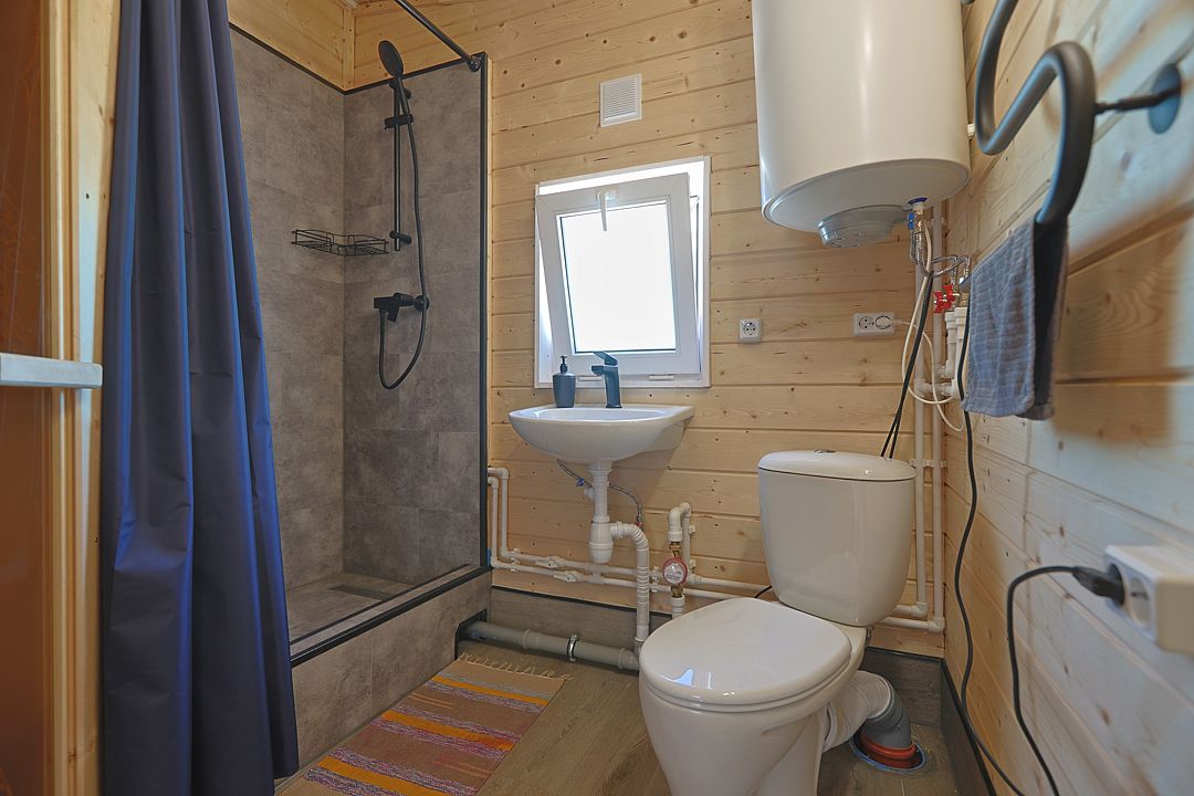 В санузле, помимо душевой кабины, есть электрическая сауна на 1-2х человек, и, конечно, горячая вода круглый год.