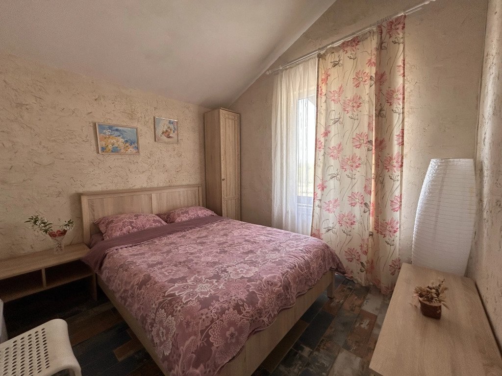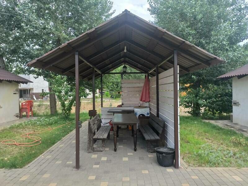 В доме две изолированные спальни, двуспальная кровать на мансарде и диван в кухонной зоне, кухня с необходимой посудой, микроволновка, сплит-систма, холодильник, беседка с мангалом и мини-кухней, мангал.