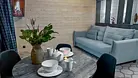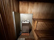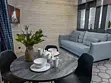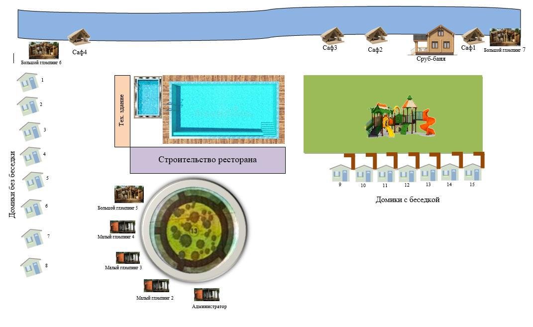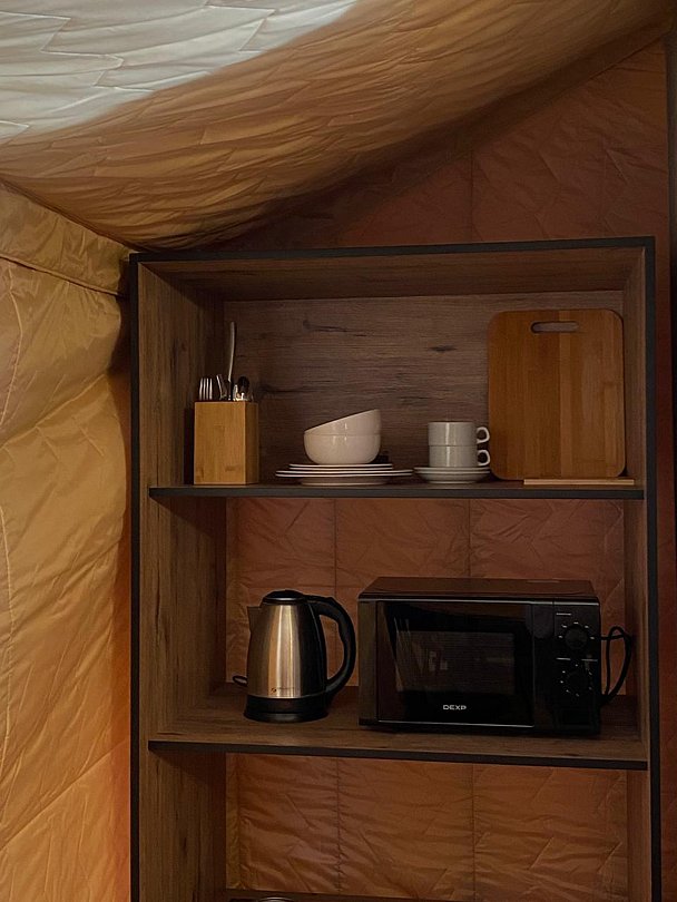 Оснащение глэмпинга: кровати спринг-бокс, диван, тумба прикроватная 2 шт., кресла 2 шт., столик чайный 1 шт., полка под ТВ 1 шт., гардеробный шкаф 1 шт. Кухонный гарнитур, посудомоечная машина, вытяжная система, раковина, смеситель, индукционная плита.