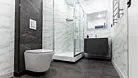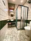 Комплексное оснащение санузла: душевая кабина, раковина с тумбой, зеркало с подсветкой и подогревом, душевой гарнитур, унитаз.