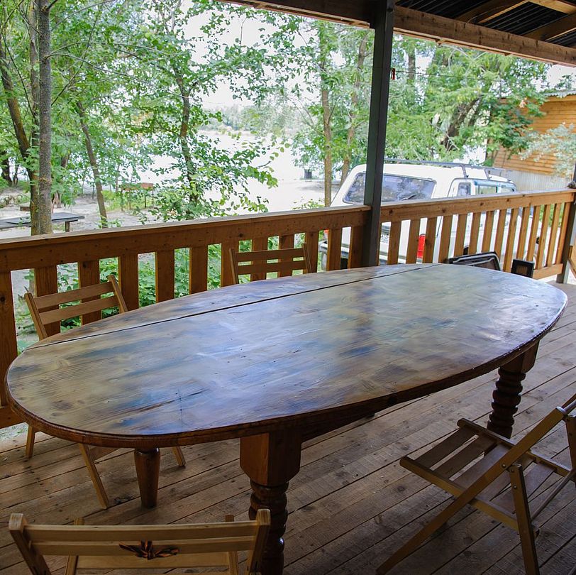В комнате раскладной диван на двух человек и кресло-кровать. В домике душевая кабина, туалет, кондиционер, холодильник, газовая плита, микроволновка, чайник, телевизор, тумбочки и посуда. Стол и стулья. Постель и полотенца. На веранде большой стол.