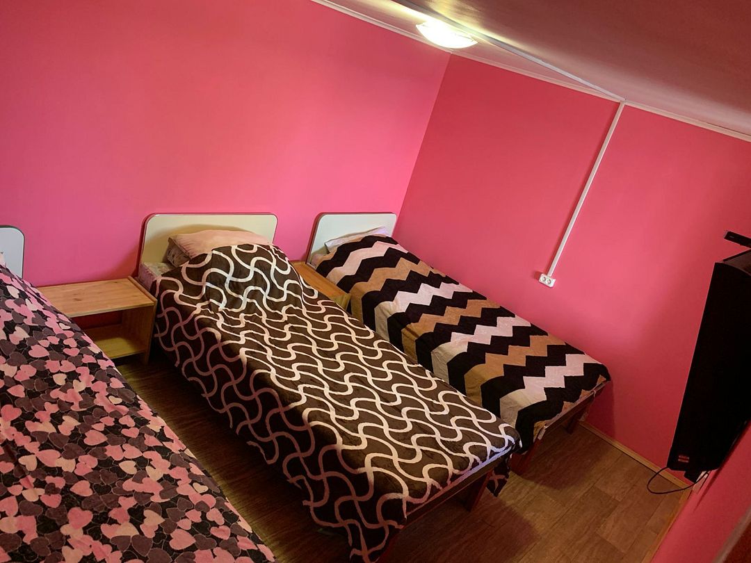 Без сан.узла. 2 односпальные кровати, диван двуспальный, кухня полностью оборудованная.
