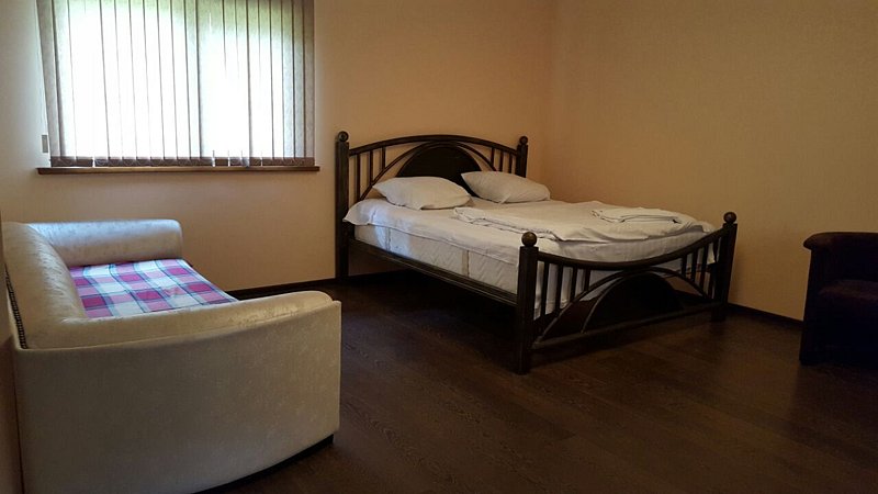 Дом двухэтажный, на первом этаже одна гостевая комната с двухместным диваном, на втором этаже две спальни с двумя односпальными кроватями.