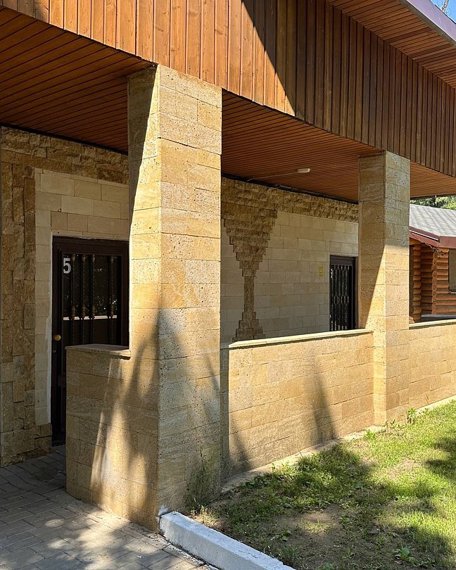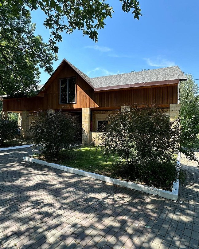 Новый двухэтажный благоустроенный коттедж, разделенный на две половины, общей вместимостью 12 человек. На первом этаже, в каждой половине расположены зал с угловым диваном на 4 спальных места, стол, кресла, камин, сплит-система, 2 санузла, 2 душевые кабины, 2 раковины. А также застекленная веранда вместимостью 25 человек. На втором этаже расположены 4 комнаты, с двуспальными кроватями, выход на балкон, с гамаком, с которого открывается прекрасный вид на дубовые аллеи.