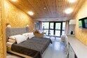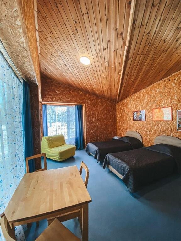 2-х уровневые срубы, состоящие из 2 номеров. В каждом номере могут разместиться до 4 человек. На первом уровне столовая, спальня и душевая. На втором уровне — открытая спальная комната.