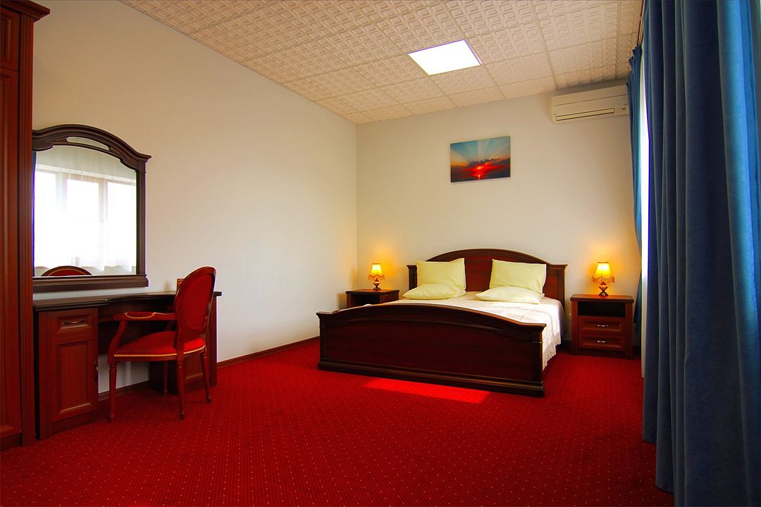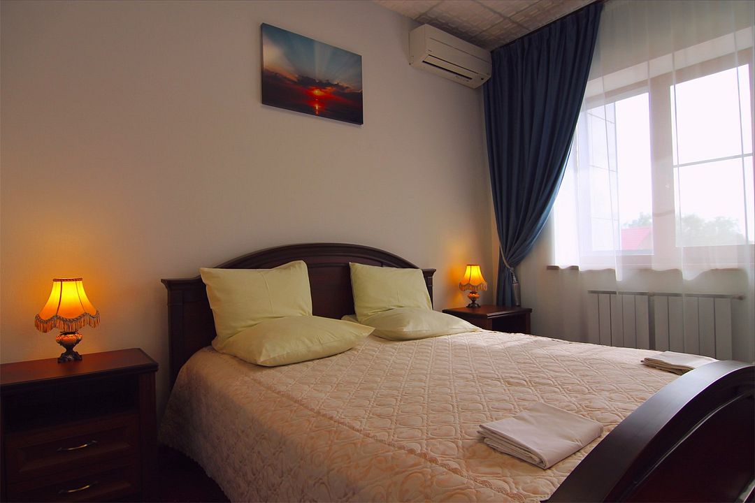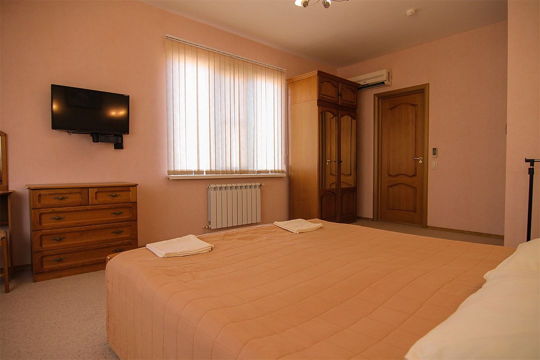 Оснащены удобной мебелью из массива. Имеется двуспальная кровать, две сплит-системы, два телевизора, мини-бар, сейф, телефон, Wi-Fi, индивидуальный санузел с душевой кабиной, биде, туалетные и гигиенические принадлежности.