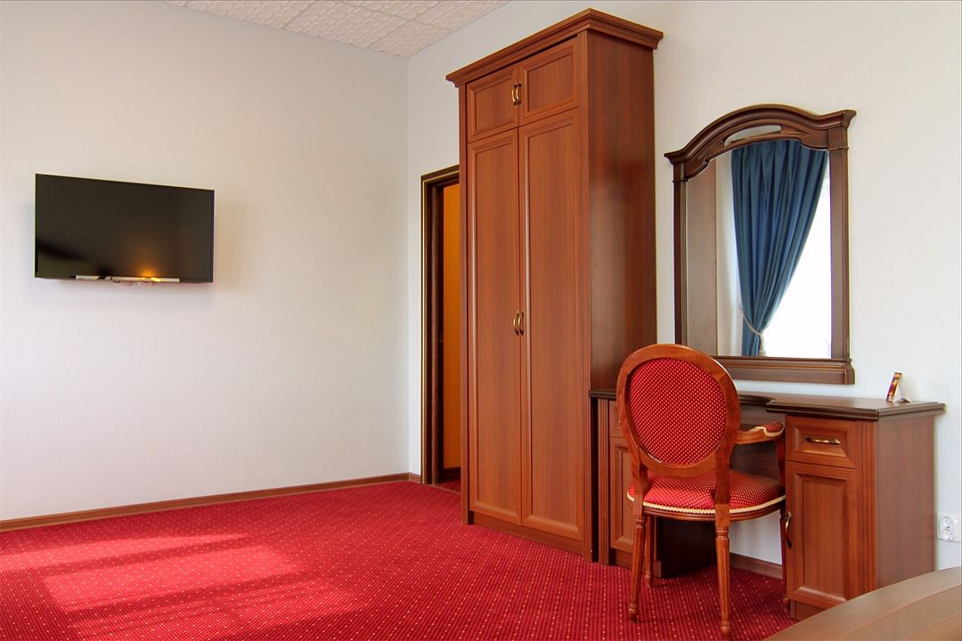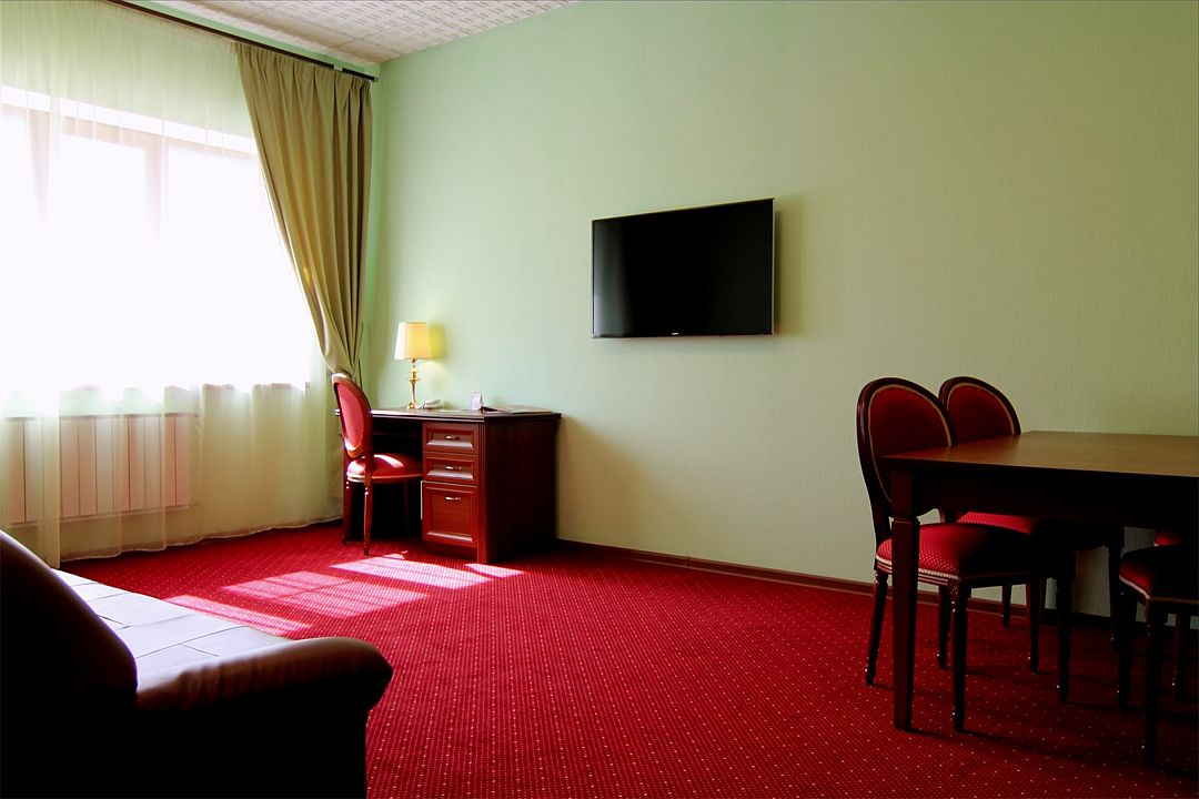 В номере две полутороспальные кровати с возможностью трансформирования в двуспальную, прикроватные тумбы, стол, шкаф для одежды, стол рабочий, диван, стол обеденный, стулья, мини-бар, Wi-Fi, индивидуальный санузел с душевой кабиной, фен, туалетные и гигиенические принадлежности