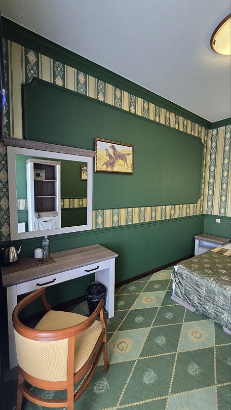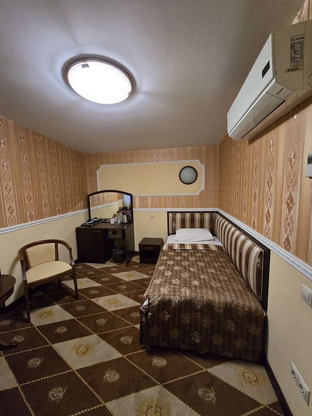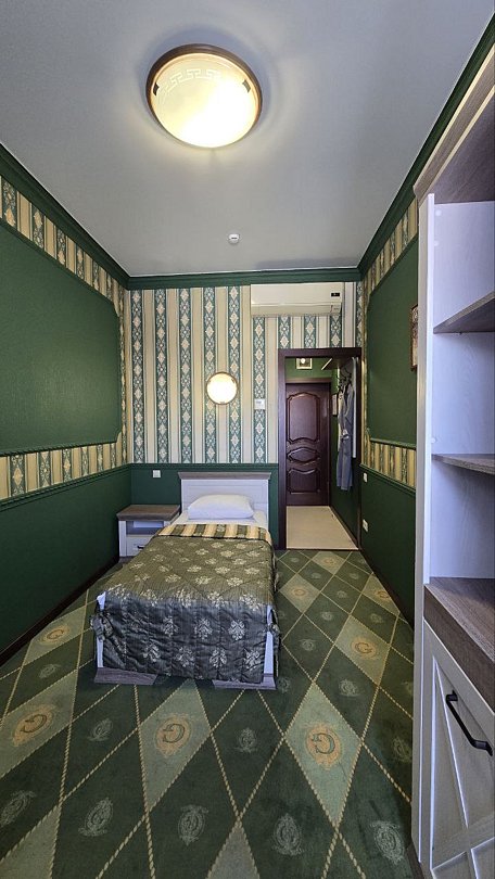 Стандартный одноместный номер 14 м² с собственной ванной комнатой, косметическими принадлежностями, халатом, тапочками. Доп. место невозможно, размещение только одного человека в номере.