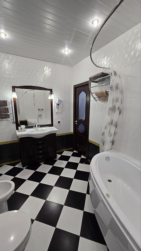 2-х этажный номер с одной двуспальной кроватью, двуспальным диван-кроватью, кухней и джакузи,90кв.м., с собственной ванной комнатой, косметическими принадлежностями, халатом, тапочками