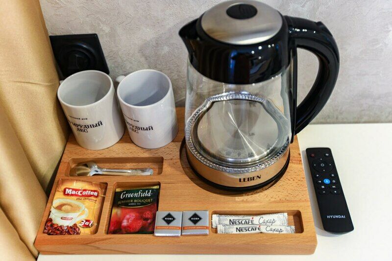 В номере есть все удобства: санузел (туалет, раковина, душ), по 3 полотенца на гостя, косметические одноразовые принадлежности, фен, кондиционер, ТВ, Wi-Fi, холодильник, электрический чайник, чай и кофе. В каждом номере есть балкон. Вид на сосновый бор или двор гостиницы.