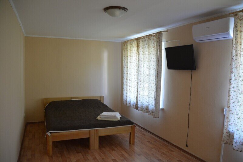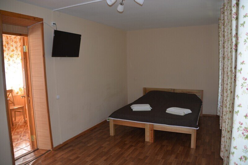 Сплит, телевизор на 20 каналов. Отдельный плюс что есть одноразовые шампунь,гель для душа, мыло, зубные щётки. Очень хорошие беседки возле домика, со светом и розетками. Мангал возле каждого дома. Очень красива территория, всё зелёное, подстриженна трава и кусты, за территорией ухаживают. Обязательно приедем туда снова.НедостаткиНе понравилось что очень маленький холодильник, может для компании без детей и норм, но с ребёнком нужен холодильник по большей. Надеюсь руководство это учтёт.
