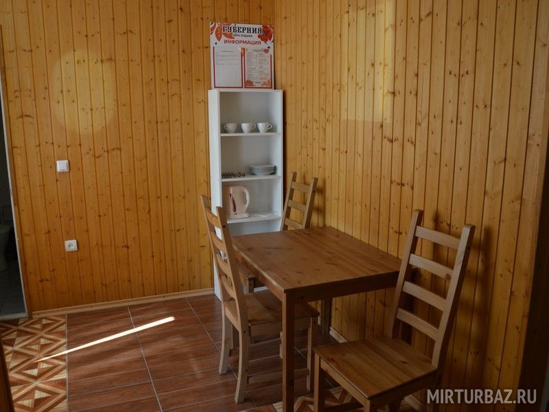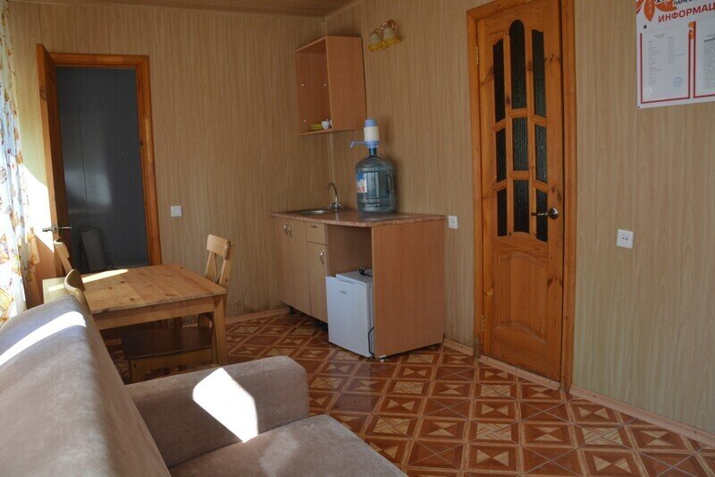 Домики повышенной комфортности. Включает спальную комнату, кухню, ванную комнату. В спальной комнате: двуспальная кровать, шкаф для одежды, тумбочка, LCD телевизор, сплит-система. Кухня: стол, стулья, холодильник, необходимая посуда, эл. чайник. В ванной комнате: душ (слив в пол) с горячей и холодной водой, фен, раковина, санузел, теплый пол, предметы личной гигиены. Домик огорожен заборчиком, рядом расположена беседка. Расположен в зоне отдыха - рядом бассейн и детская площадка. Рассчитан на 2 человека с возможностью увеличения мест до 4.