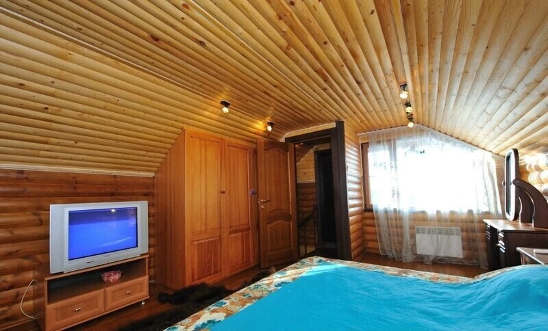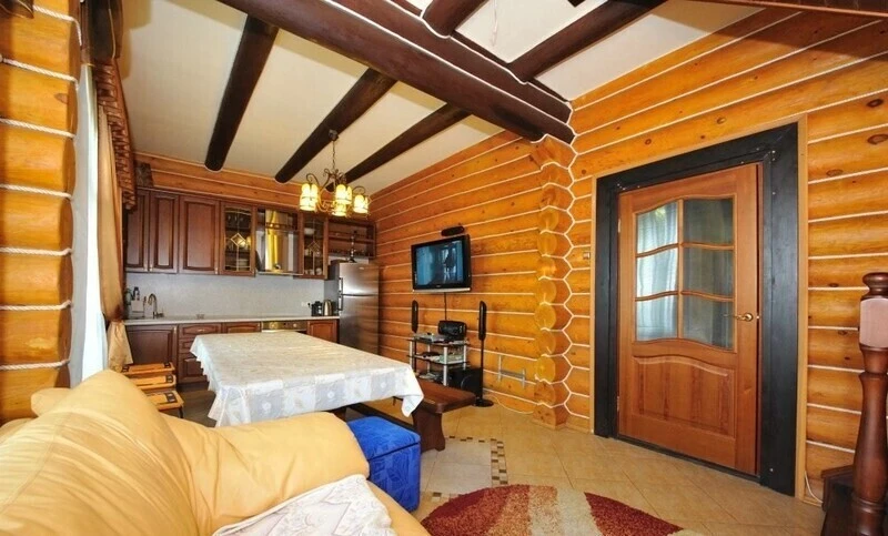 Гостевой двухэтажный домик на 7 или 8 мест оборудован кухней. Спальня на первом этаже с двуспальной кроватью и диваном. Спальня на втором этаже включает в себя три одноместные кровати. В доме есть телевизор, холодильник и сплит-системы. Две ванные комнаты (на 1-м и на втором этаже).