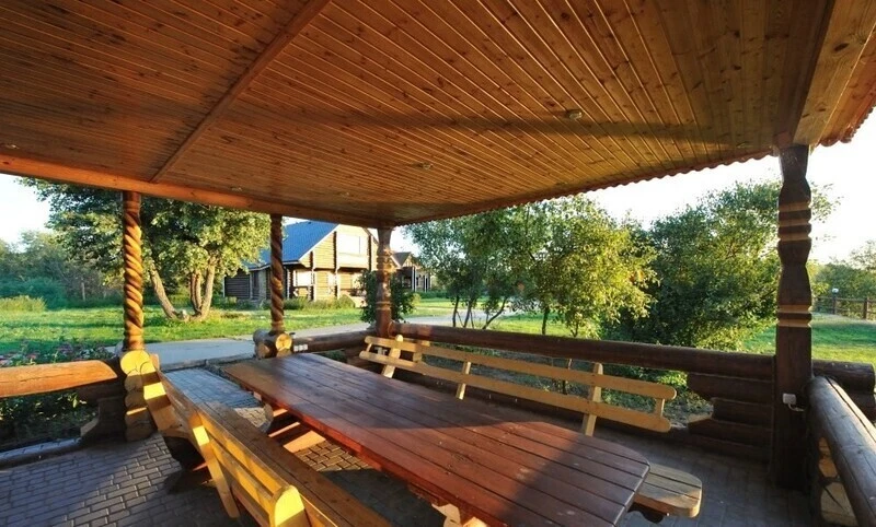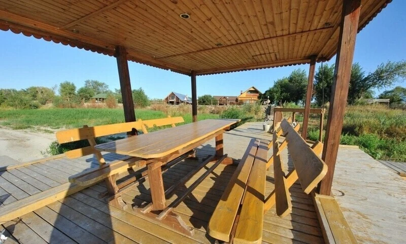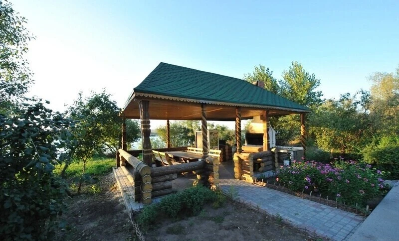 Беседка расположена на территории, чуть подальше от воды, но вид отсюда открывается не менее живописный. Под этим навесом оборудован мангал и все необходимое для приготовления шашлыка.
