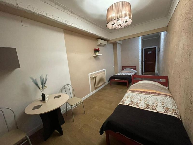 Уютная комната эконом, оборудованная всем необходимым для комфортного проживания. В комнате две односпальные кровати, кондиционер, телевизор, холодильник, чайник, санузел с душем.