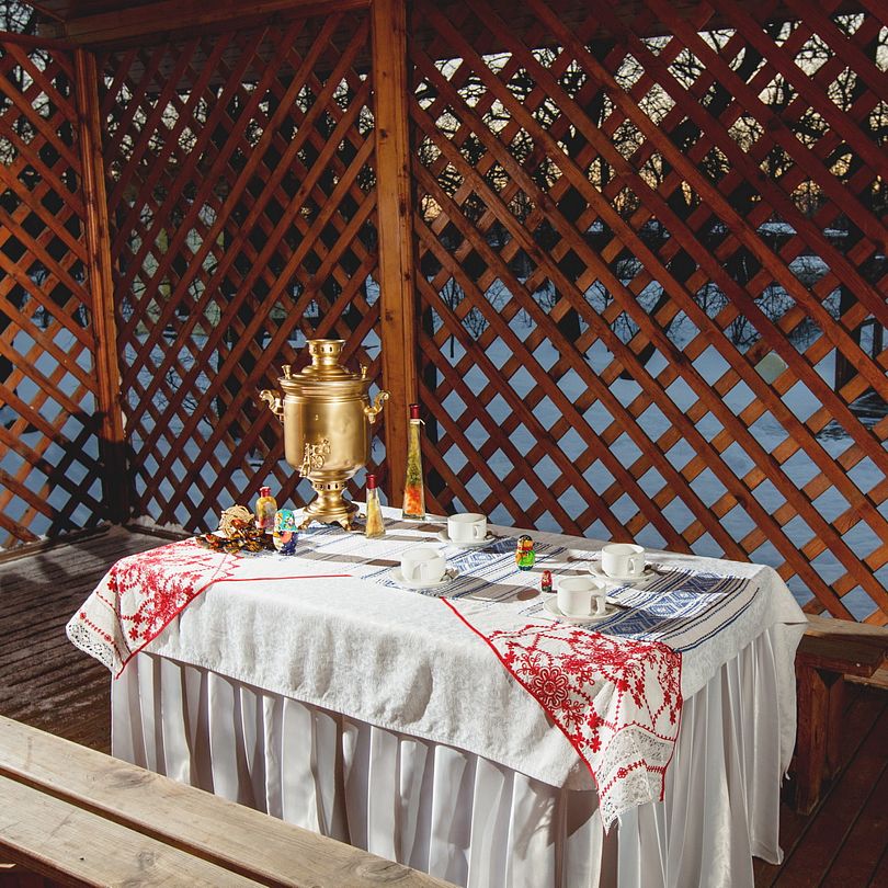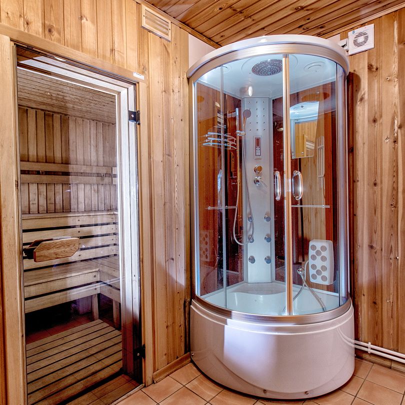 Сауна оборудована душевой кабиной, локацией для чаепития или застолья, в теплое время года есть даже выход на веранду.