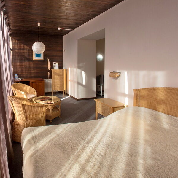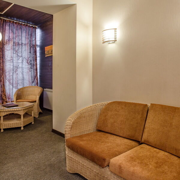 Двухкомнатный двухместный номер, расположен на 3 этаже нашего гостиничного комплекса с прекрасным видом из окна. Номер оснащен двуспальной кроватью размером 200х160см, кожаными диванами, прикроватными тумбочками, журнальным столиком. В номере 2 телевизора, сплит-система, холодильник, два вместительных шкафа, обеденный стол, набор посуды. В ванной комнате: душевая кабина, биде. Гостям предоставляются тапочки, халат, фен, наборы полотенец и гигиенических средств. В номере бесплатный Wi-Fi.
