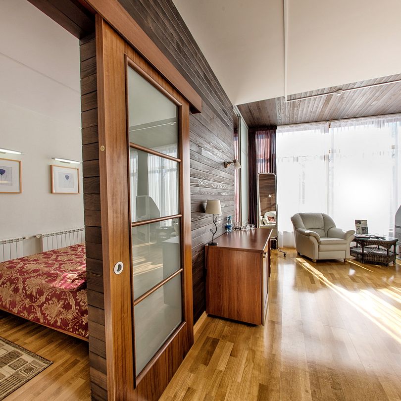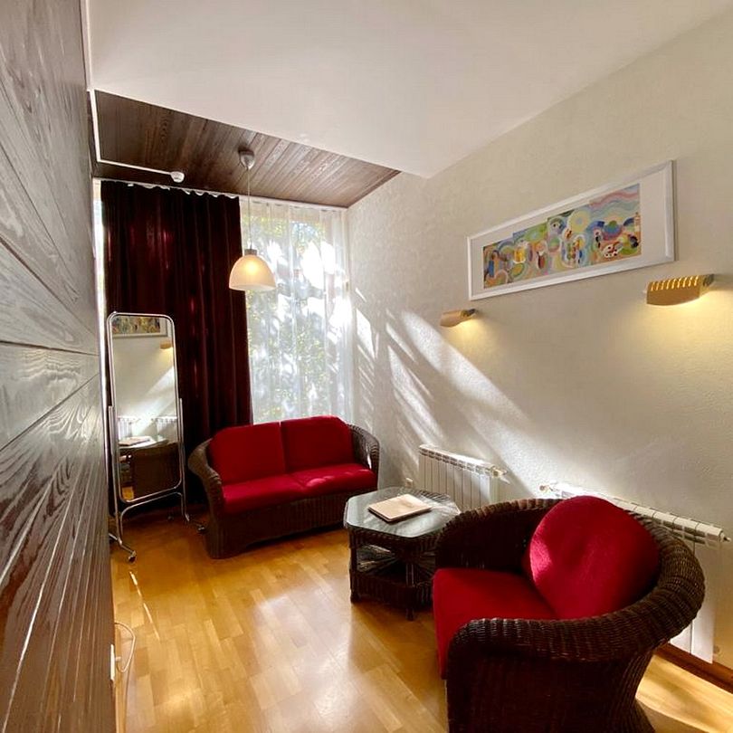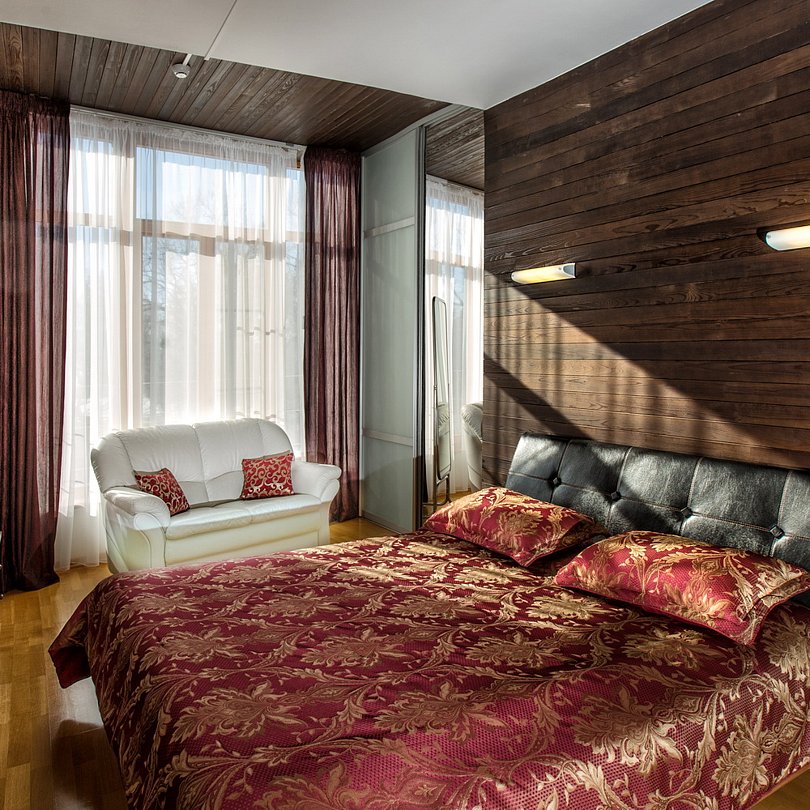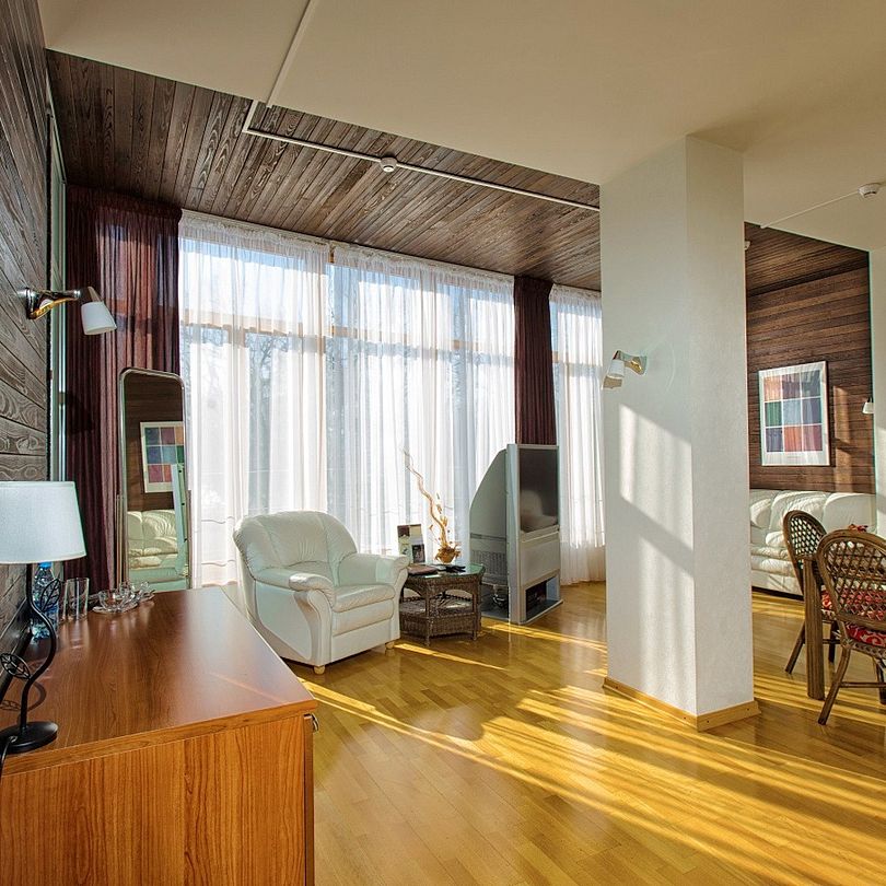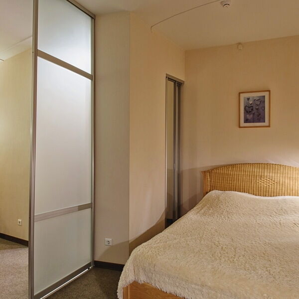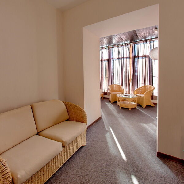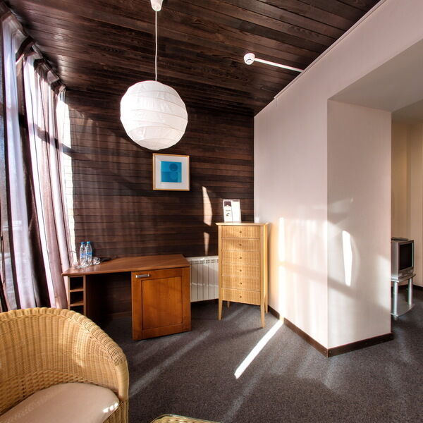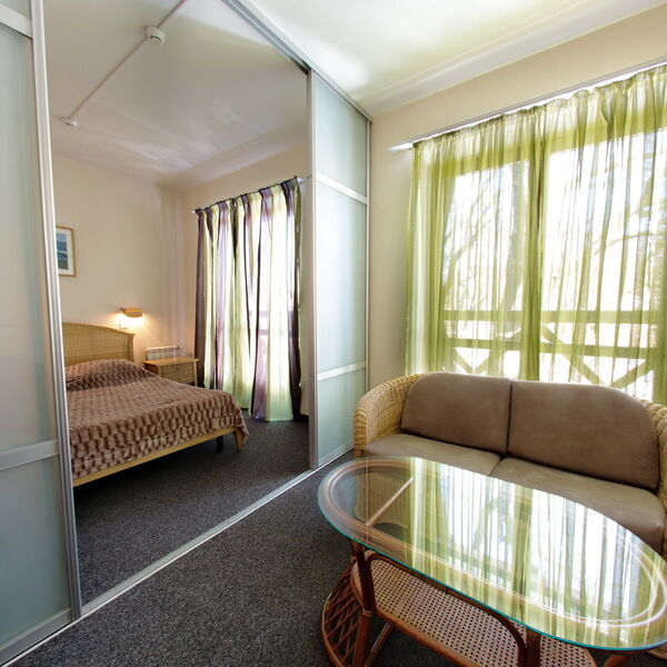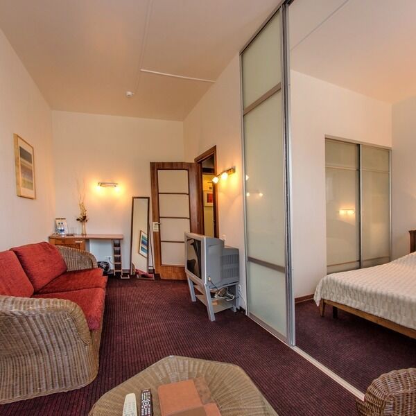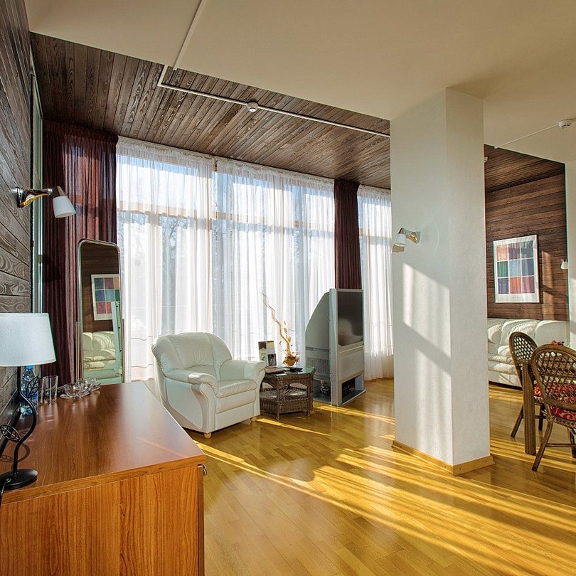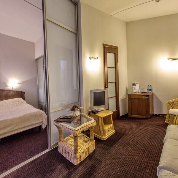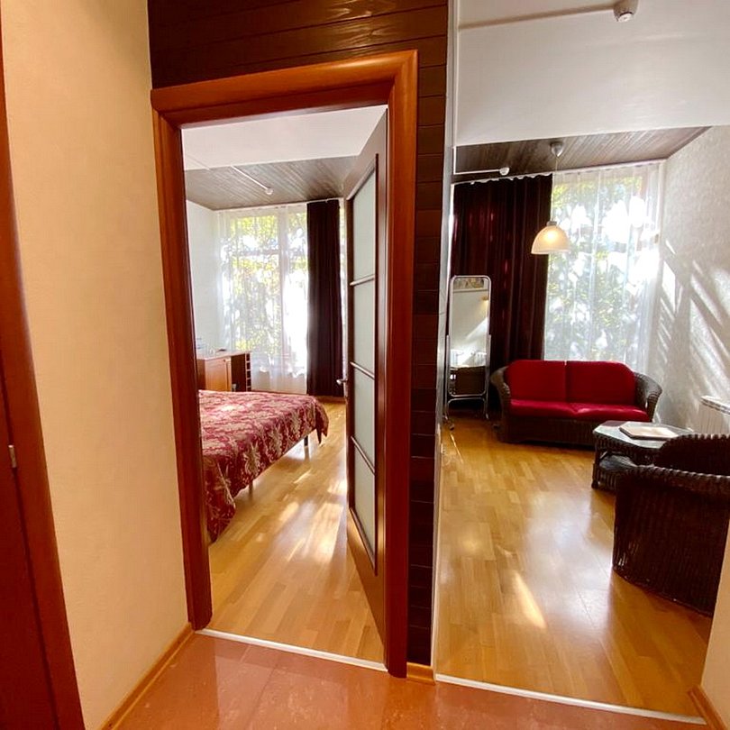 Просторный, светлый номер в 4-этажном корпусе, состоит из спальни, ванной, гостиной и прихожей.