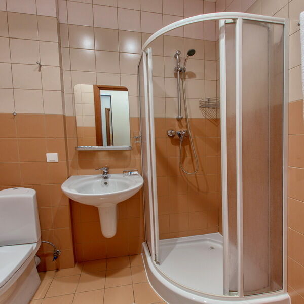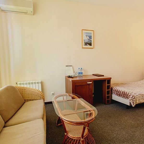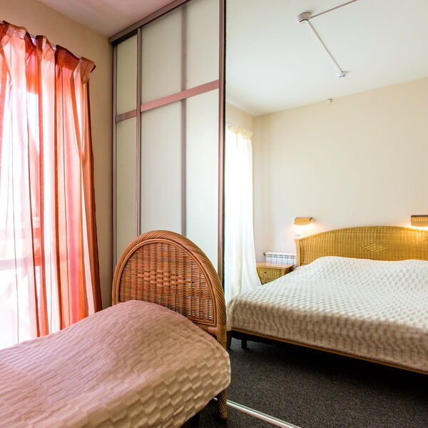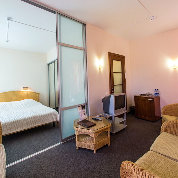 Двухкомнатный номер, расположен на 2 этаже гостиничного комплекса. Номер оснащен кроватями размером 200х160 см. и 200х80 см., диваном, прикроватными тумбочками, журнальным столиком, телевизором, сплит-системой, холодильником, вместительным шкафом, набором посуды. В ванной комнате: душевая кабина. Гостям предоставляются наборы полотенец и гигиенических средств.
