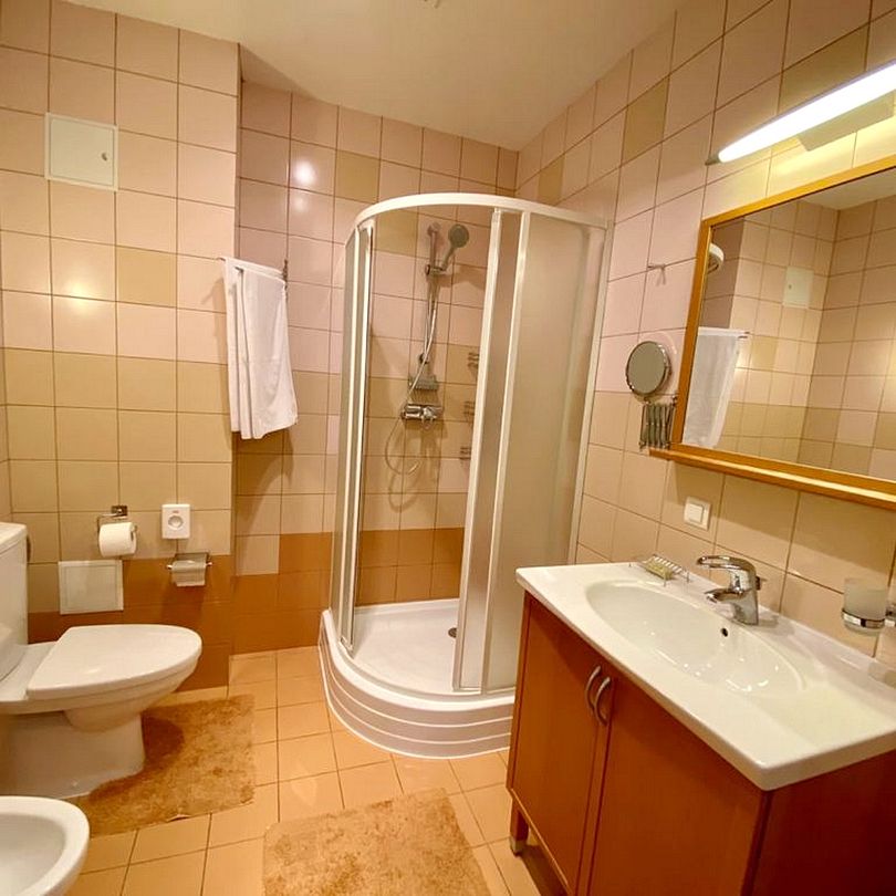 Двухкомнатный двухместный номер, расположен на 3 этаже нашего гостиничного комплекса с прекрасным видом из окна. Номер оснащен двуспальной кроватью размером 200х180см, диваном, прикроватными тумбочками, журнальным столиком, телевизором, сплит-системой, набором посуды, холодильником. В номере два вместительных шкафа. В ванной комнате: душевая кабина, биде. Гостям предоставляются тапочки, халат, фен, наборы полотенец и гигиенических средств. В номере бесплатный Wi-Fi.