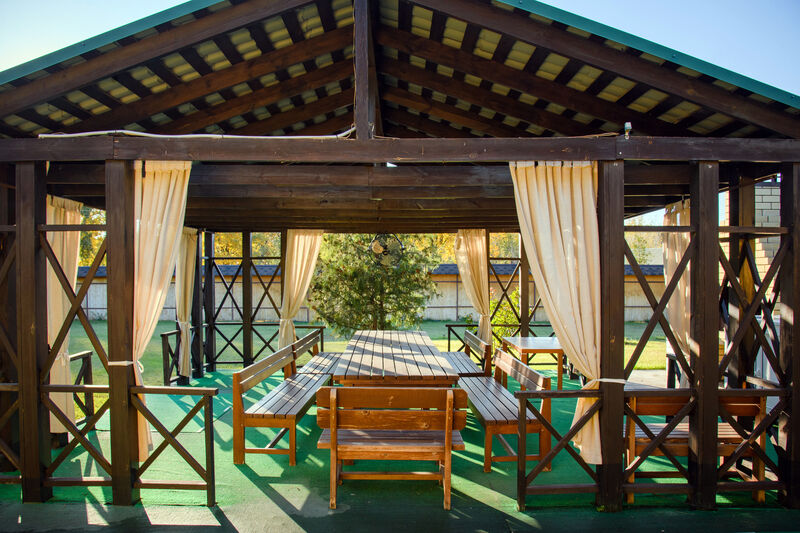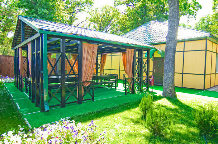 - Таверна. Рассчитана на 50–80 человек, оборудована кухней с посудой для сервировки и мангалом.