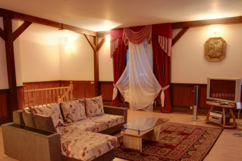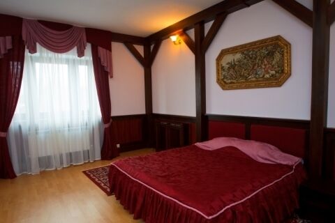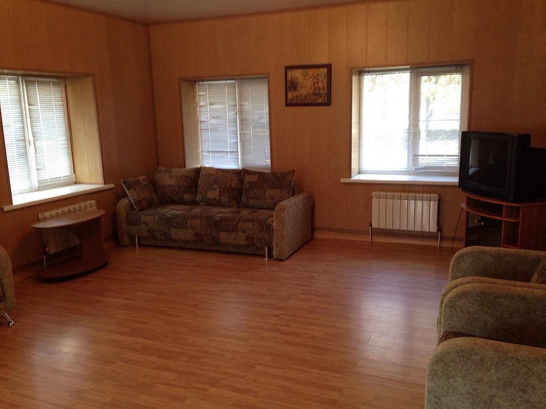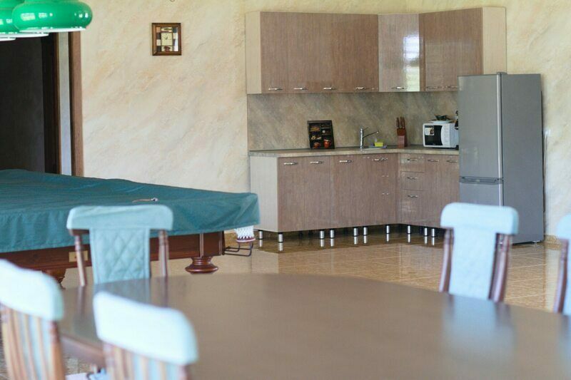 В каждой из них есть телевизор, сплит-система, платяной шкаф. В просторной гостиной мягкая мебель, большой банкетный стол, телевизор, микроволновая печь, холодильник, телефон. Здесь же установлен бильярдный стол. Атмосферу загородного отдыха и уюта создает камин. 2 ванные комнаты оборудованы душем, имеется гостевой санузел. Рядом с домом расположена беседка c мангалом.