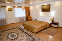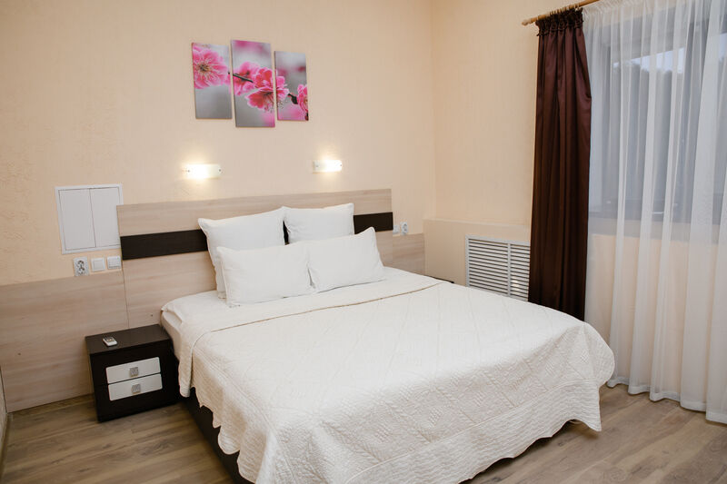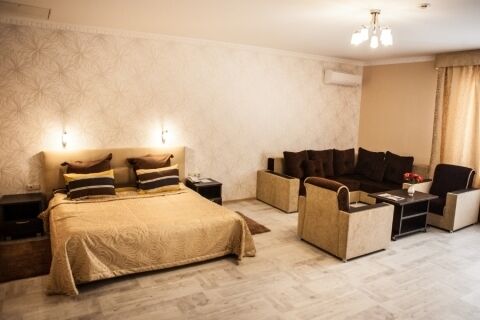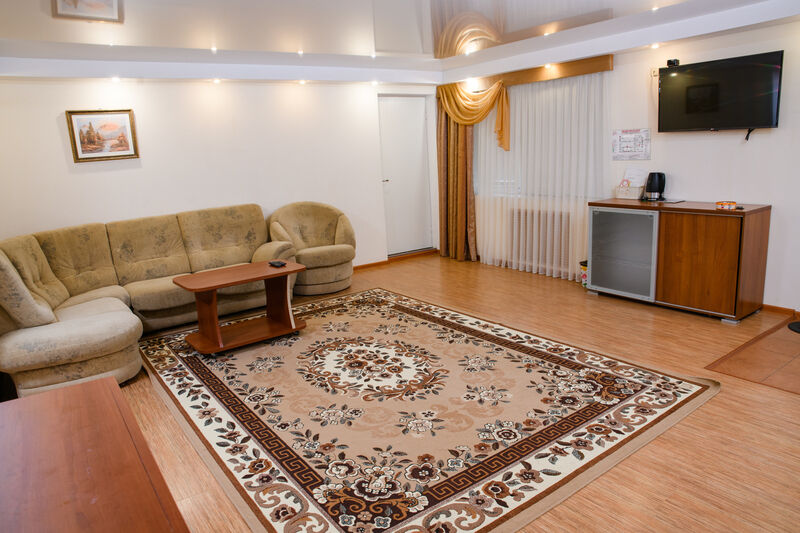Современный комфортабельный номер, зонированный на спальню и гостиную. В номере: одна двуспальная или две двуспальные кровати, мягкая мебель, телевизор, сплит-система, электрический чайник, холодильник. В ванной комнате: душевая кабина, раковина, санузел, фен.