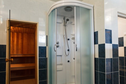 Дом Президента — это комфортабельный двухэтажный коттедж. На втором этаже располагается уютная комната, зонированная на спальню и гостиную с мягкой мебелью. Есть телевизор, сплит-система, гардеробная. Первый этаж занимает сауна и санузел. К услугам гостей мини-бар.
