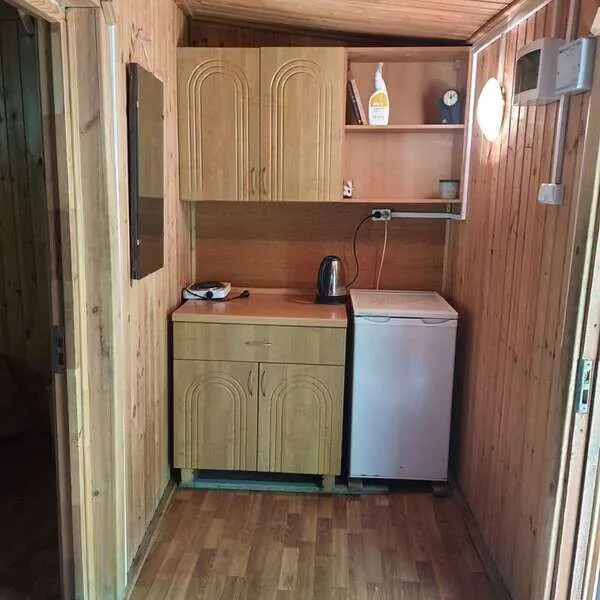 В числе удобств холодильник, плита, чайник, столовая посуда.
