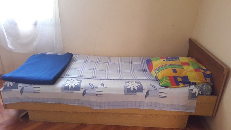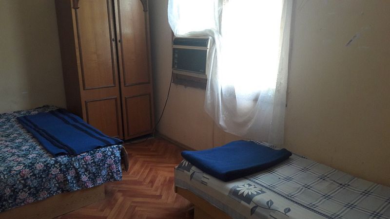 В доме тумбочка, столик, холодильник, кондиционер, две кровати.