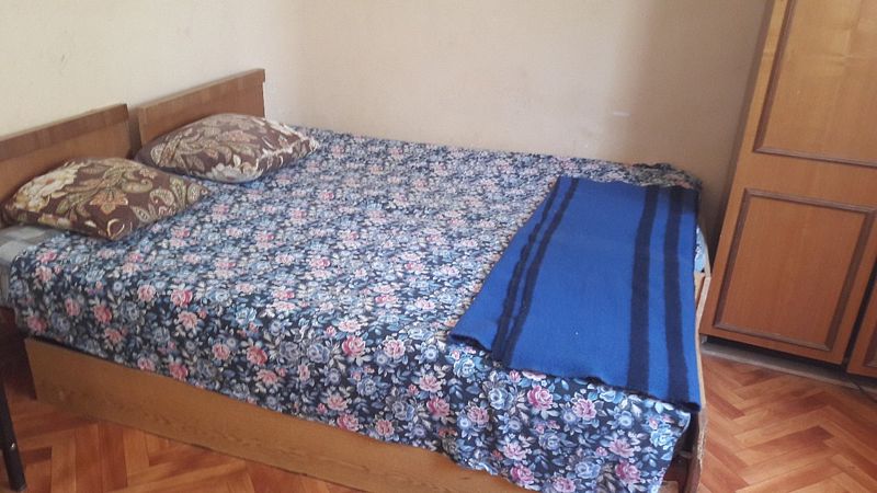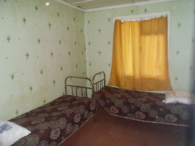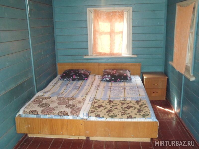 В домике двуспальная кровать или раскладной диван, либо две односпальные кровати, тумбочка, зеркало.