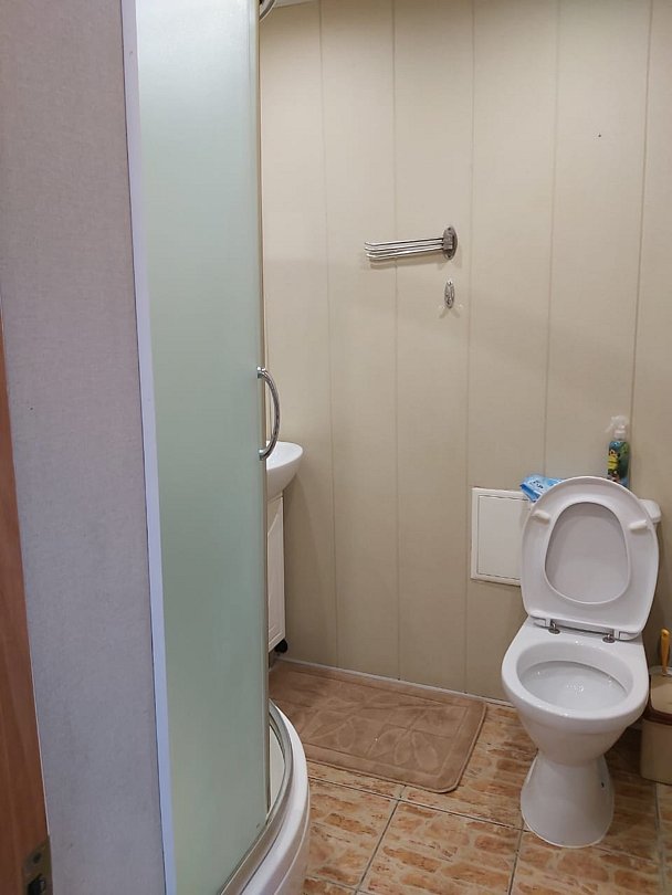 Комната оснащена современным санитарным узлом включающем в себя: душевую кабину, шкаф для личной гигиены, унитаз, биде, фен, розетка для бритвы, комплект полотенец.