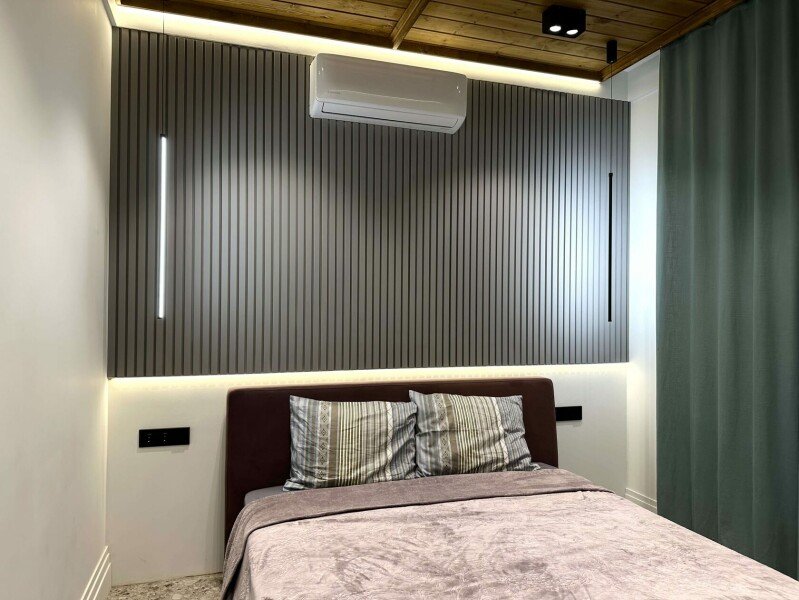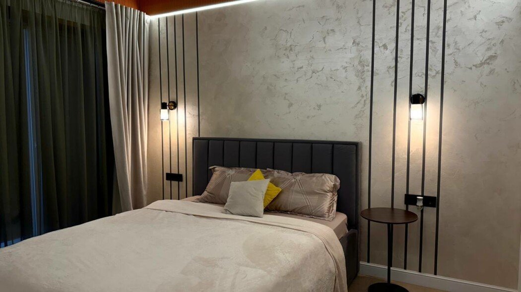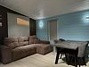 2 спальни, кухня-гостиная: раскладной диван, кухонный уголок, чайник, холодильник, микроволновка, плита, рабочее пространство.
