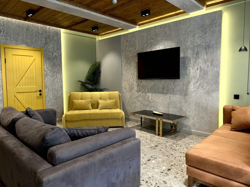 1 спальня, кухня-гостиная: раскладной диван, кухонный уголок, чайник, холодильник, микроволновка, плита. Собственная баня и бассейн. Терраса с мебелью и мангальная зона.