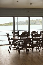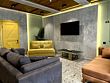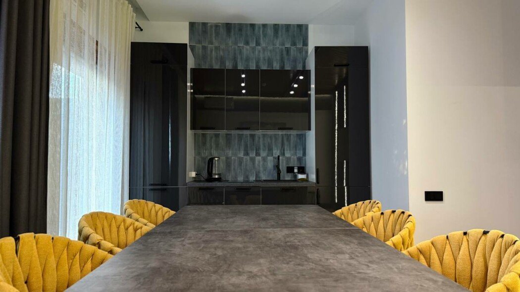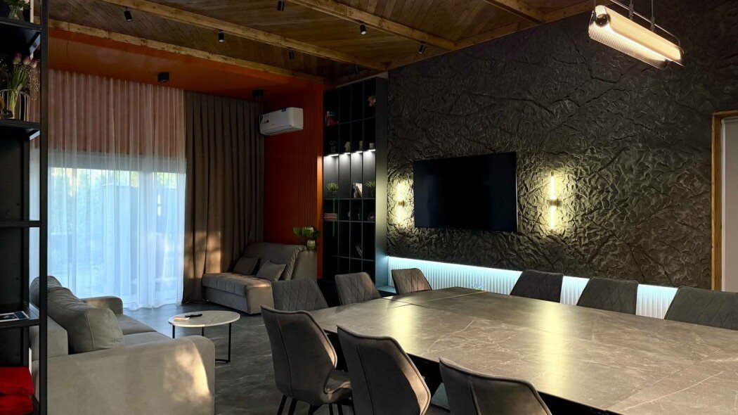 Обеденная зона с двумя большими столами, кухонный уголок — холодильник, плита, чайник, микроволновка. Терраса с мебелью, мангальная зона. В доме единое пространство без спален. Рабочее пространство, дополнительные подушки и одеяла.