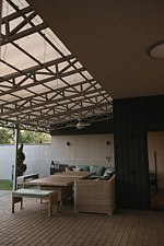 Дом с большой застекленной террасой, летом прохладно, зимой теплый пол.