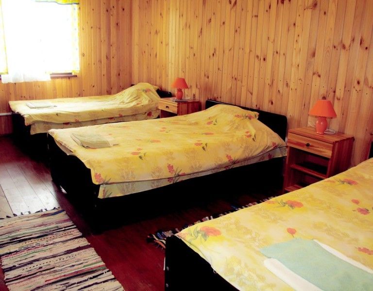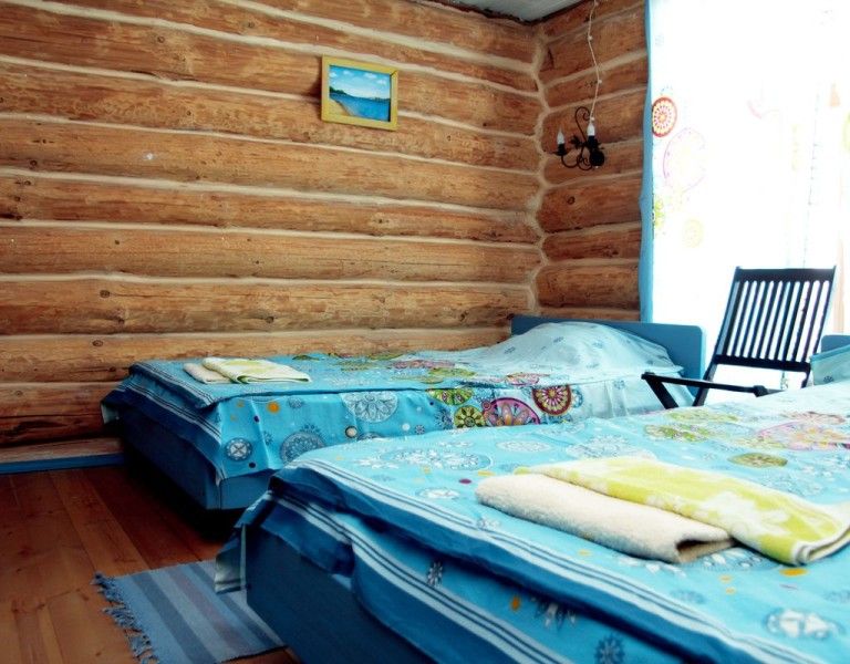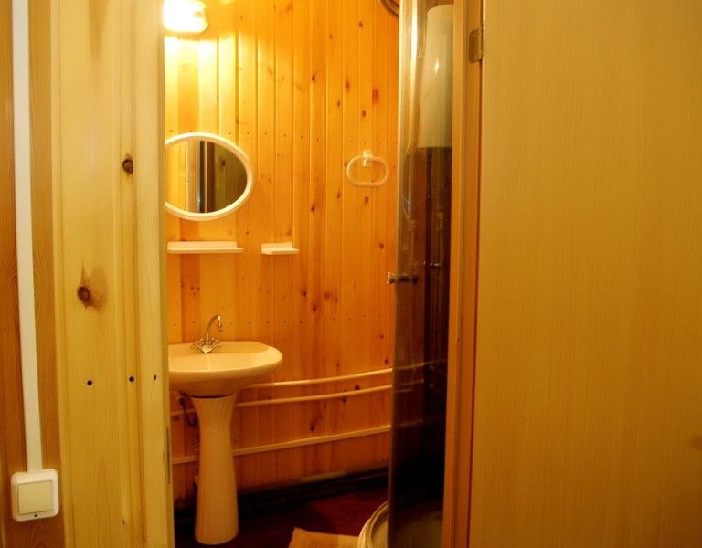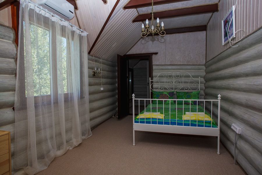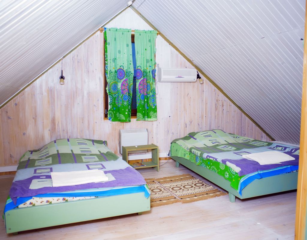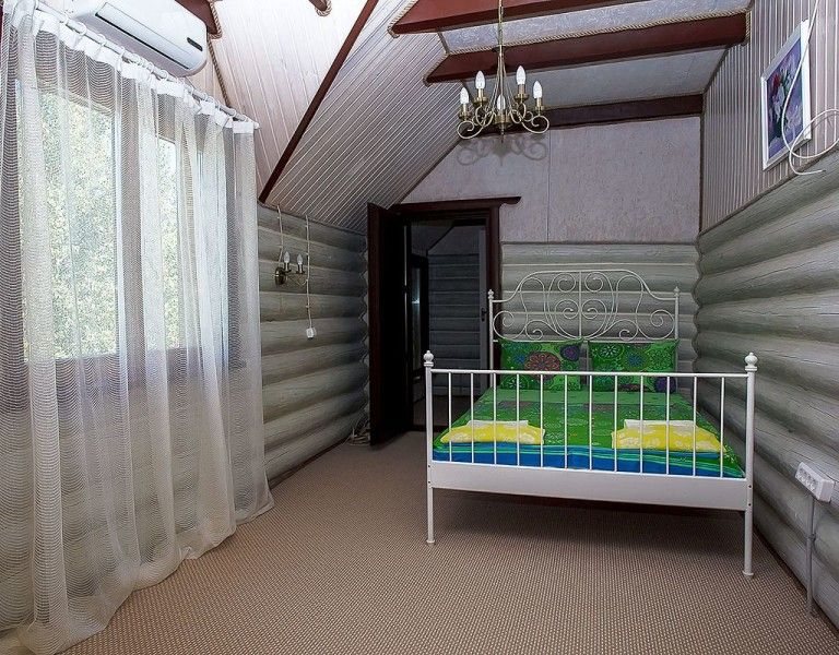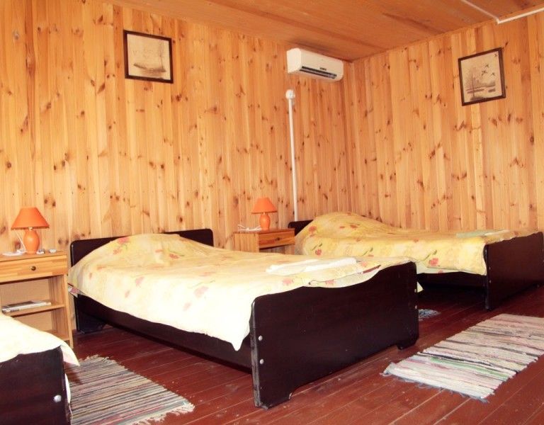 В каждом доме 2 четырехместных двухэтажных номера с мансардой. Комната на первом этаже разделена на две части полустенком высотой 90 см. Две раздельные кровати полуторные, стол, стулья, телевизор LCD, двд ресивер(триколор ТВ), кухонный уголок с маленьким холодильником, электрический чайник, набор посуды, душевая кабина, унитаз, раковина. На полу мягкий ковролин, окна деревянные, стены – сруб. Отопление электрическое, инфракрасные обогреватели над каждой кроватью, сплит-система на каждом этаже. На втором этаже – две кровати (каждая шириной 120 см, длиной 200 см), санузел (раковина, унитаз). Площадь комнаты на первом этаже около 30 метров. На втором чуть меньше за счет скоса крыши.