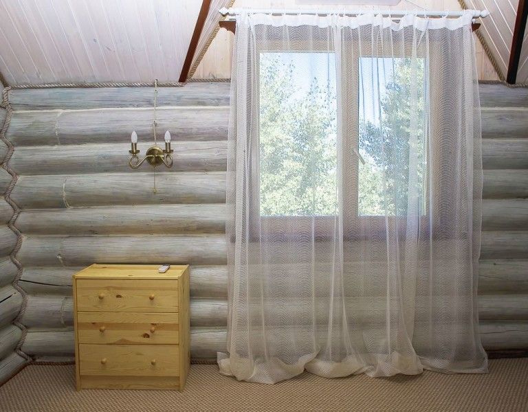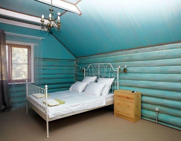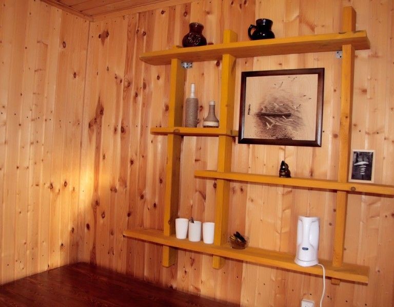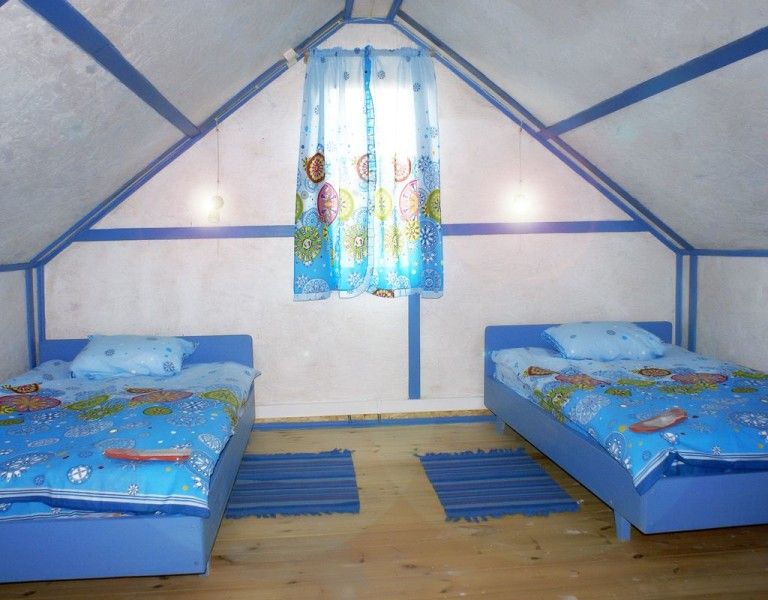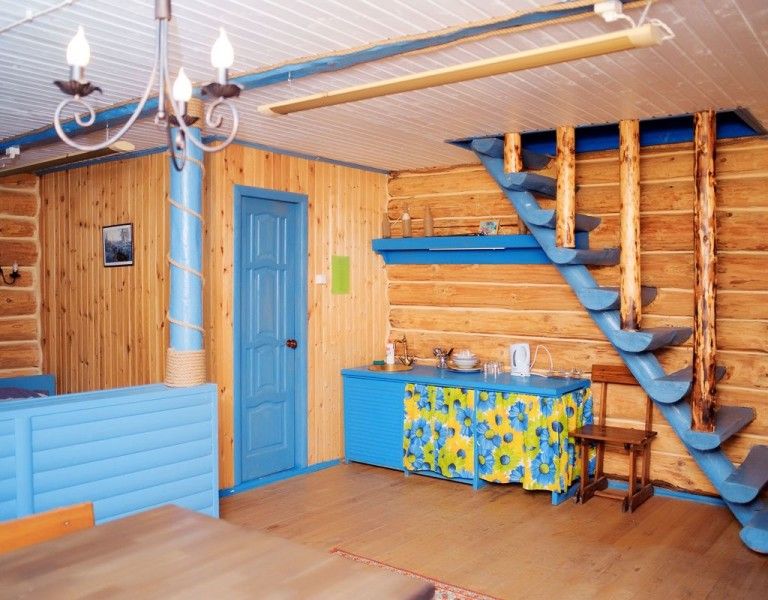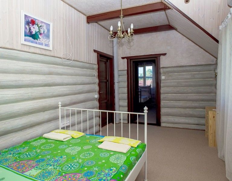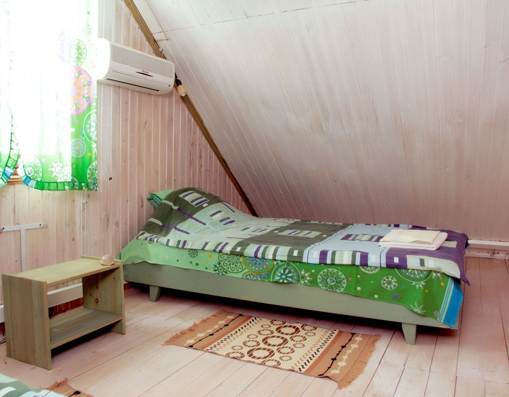 В каждом доме 2 четырехместных двухэтажных номера с мансардой. Комната на первом этаже разделена на две части полустенком высотой 90 см. Две раздельные кровати полуторные, стол, стулья, телевизор LCD, двд ресивер(триколор ТВ), кухонный уголок с маленьким холодильником, электрический чайник, набор посуды, душевая кабина, унитаз, раковина. На полу мягкий ковролин, окна деревянные, стены – сруб. Отопление электрическое, инфракрасные обогреватели над каждой кроватью, сплит-система на каждом этаже. На втором этаже – две кровати (каждая шириной 120 см, длиной 200 см), санузел (раковина, унитаз). Площадь комнаты на первом этаже около 30 метров. На втором чуть меньше за счет скоса крыши.