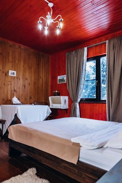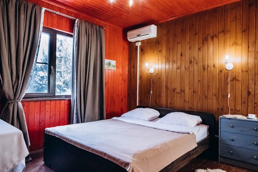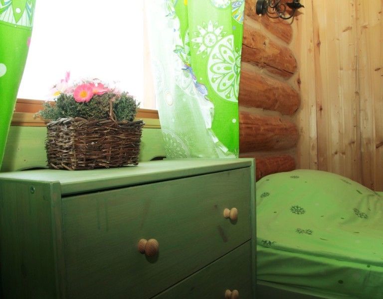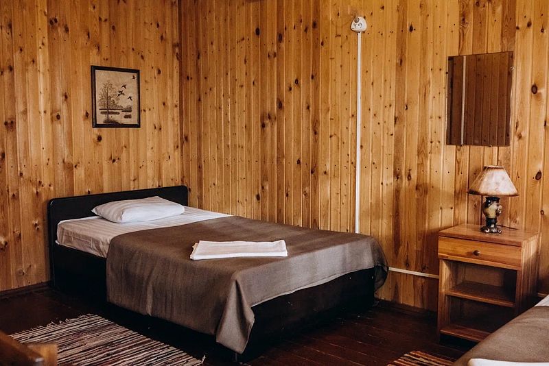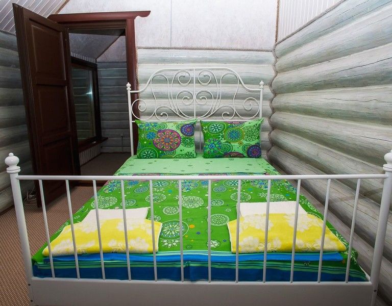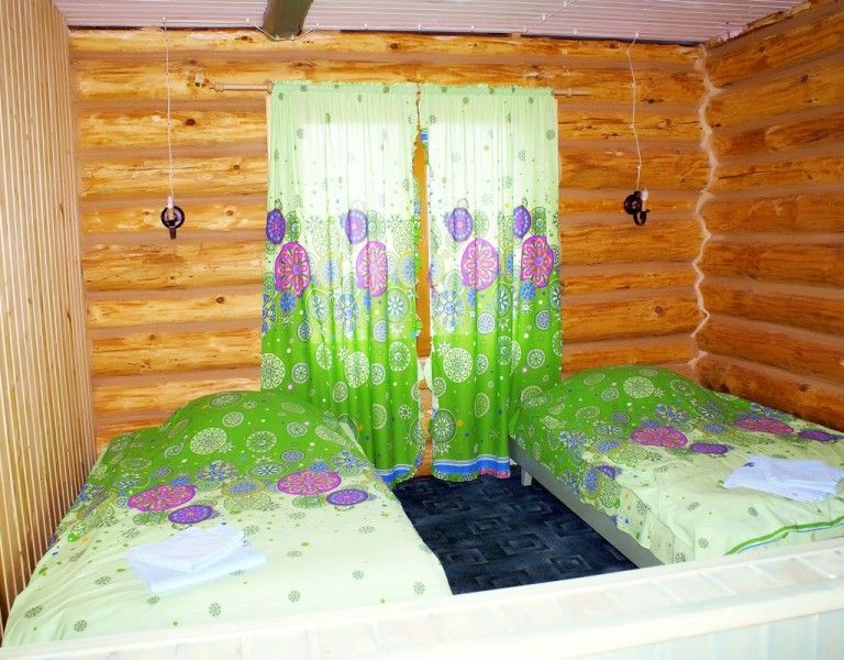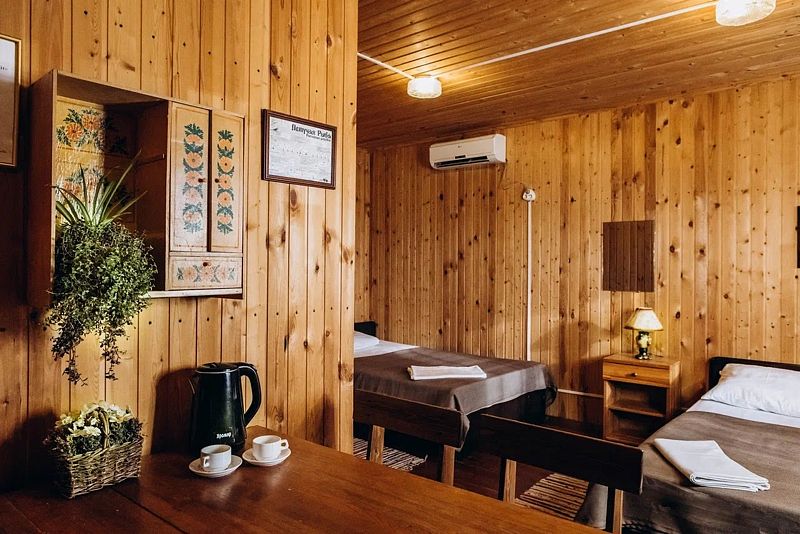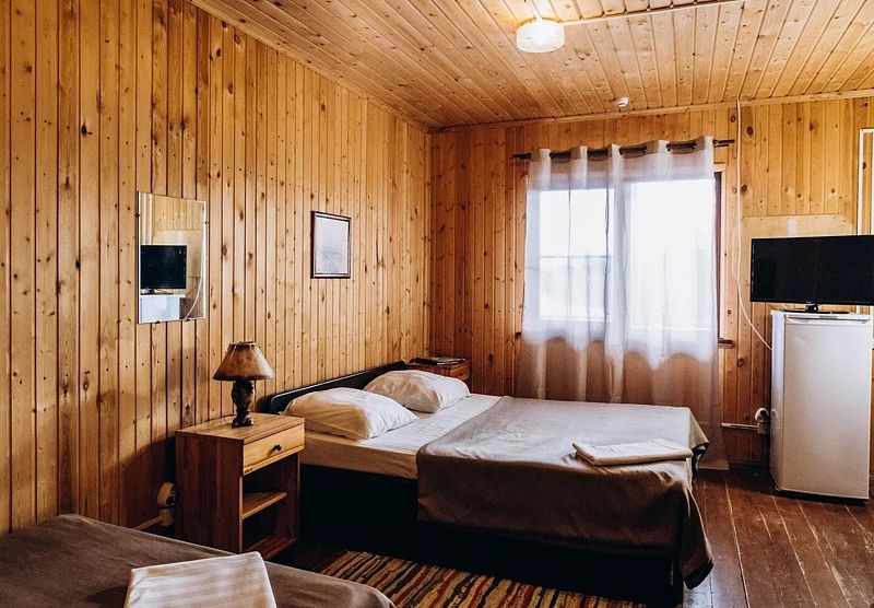 Двухместный домик из настоящего тесаного бревна, расположен рядом с рестораном и зоопарком. Комната разделена на две части «полустенком» высотой 90 см. В домике есть санузел.