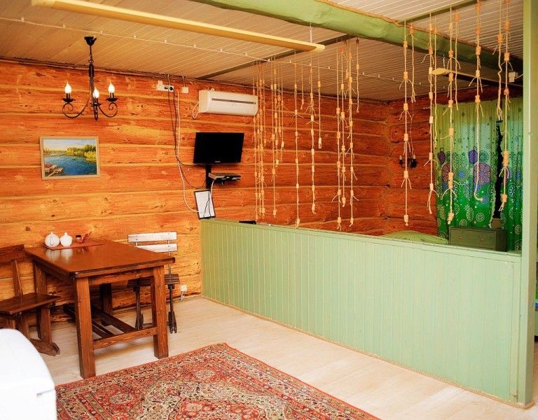 Инфраструктура: дубовые веникиРасположение: выход к рекеСруб на реке с панорамными окнами, настоящая дровяная печка, влажная парная, дубовые веники, матрасы из лугового сена, облив холодной водой и прорубь. Немножко качает, пока пьешь травяной чай с медом.