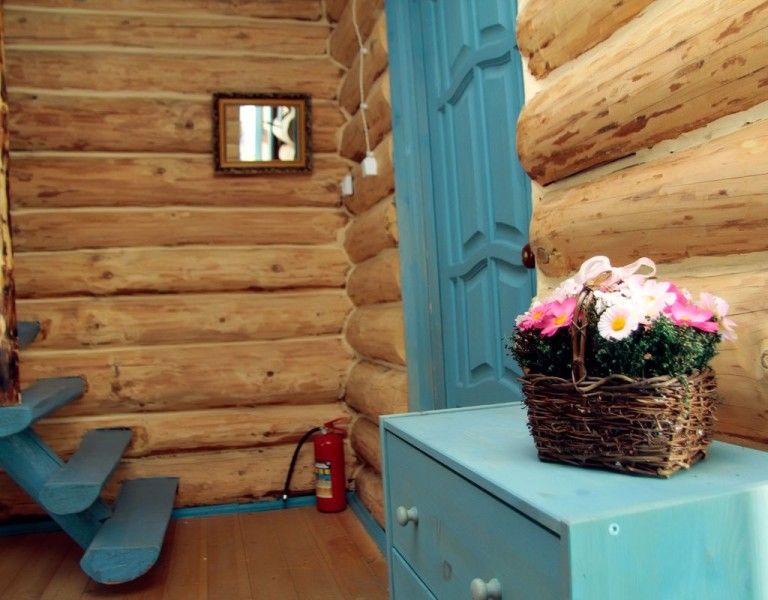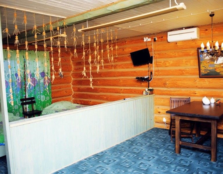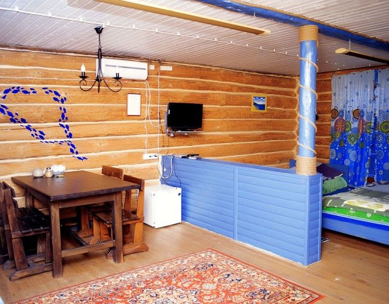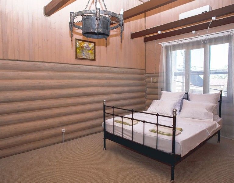 В каждом доме 2 двухместных номера. Двухместный домик из настоящего тесаного бревна, расположен рядом с рестораном и зоопарком. В домике есть санузел. Есть кухонный, удобный уголок. Набор посуды (тарелки, кружки, столовые приборы), дополнительная раковина, холодильник. Телевизор плоский с выходом для USB и кабельным телевидением. Комната разделена на две части полустенком высотой 90 см. Две кровати шириной 120 см каждая, стол со стульями. Душ с кафелем, унитаз, раковина — холодная, горячая вода. Отопление электрическое, плюс инфракрасные обогреватели, сплит-система.
