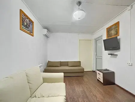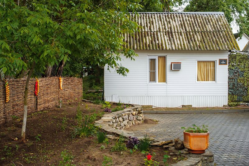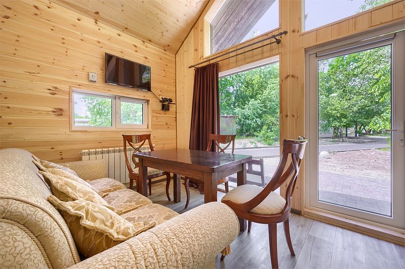 Домик включает в себя гостиную комнату, две спальни, оборудованную кухню (электроплита, электрочайник, комплект посуды), душ, туалет, сплит-систему и кабельное TV.