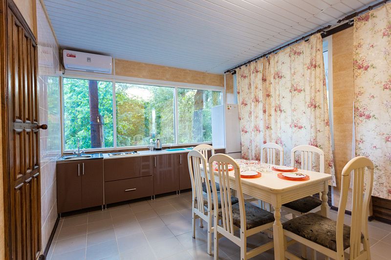 Домик включает в себя, три спальни, оборудованную кухню (электроплита, электрочайник, комплект посуды), душ, туалет, сплит-систему и кабельное TV.