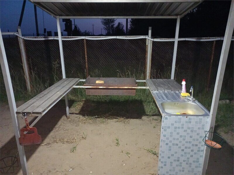 Имеется большой стол, стул-кресло холодильник, освещение, розетки, свой мангальный-остров с водоснабжением (вода питьевая) и освещением, рядом можно расположиться с палатками.