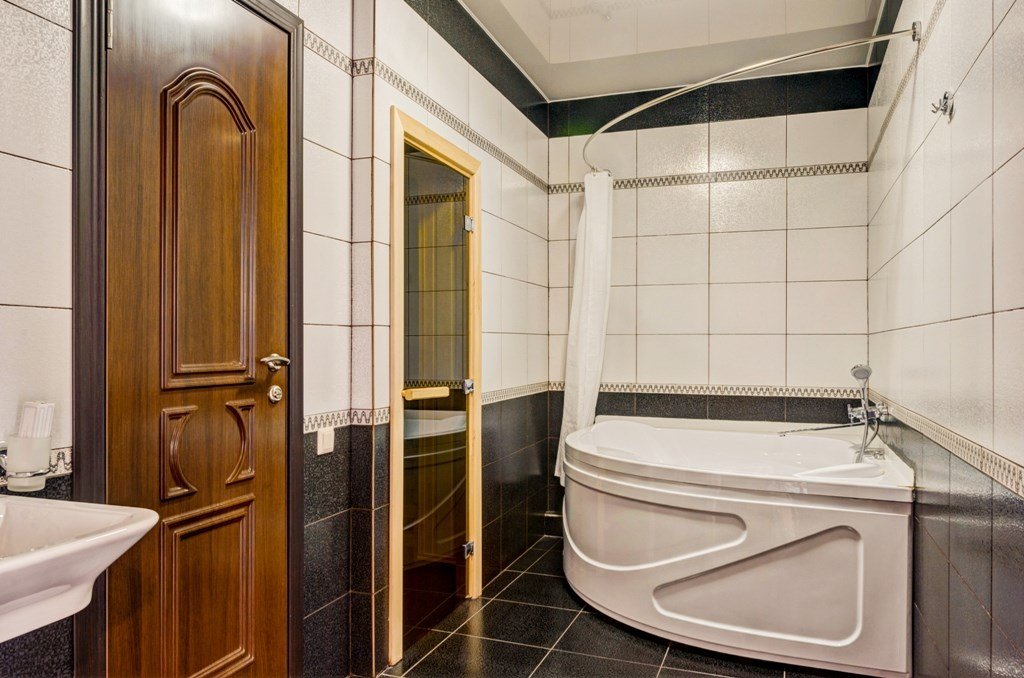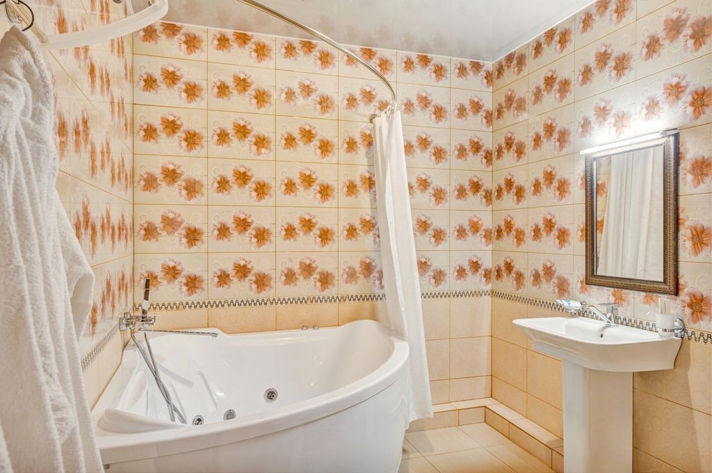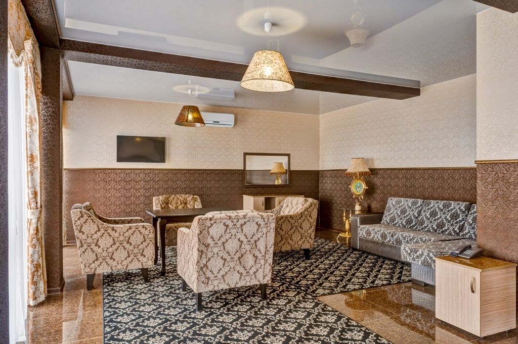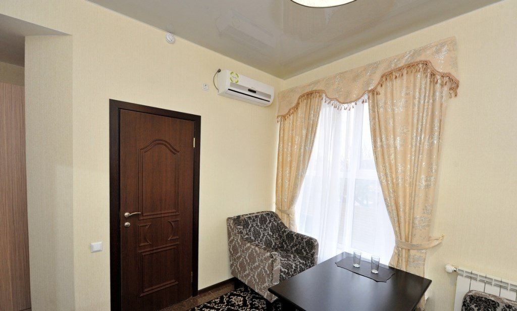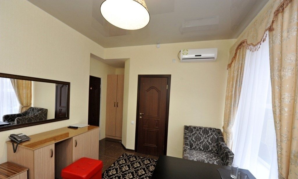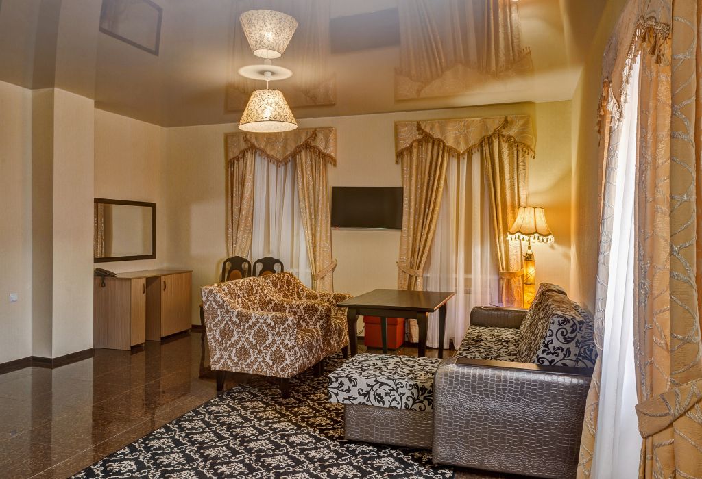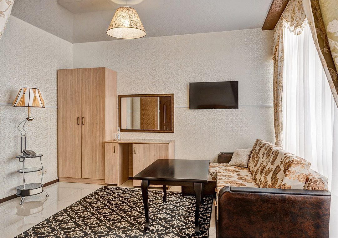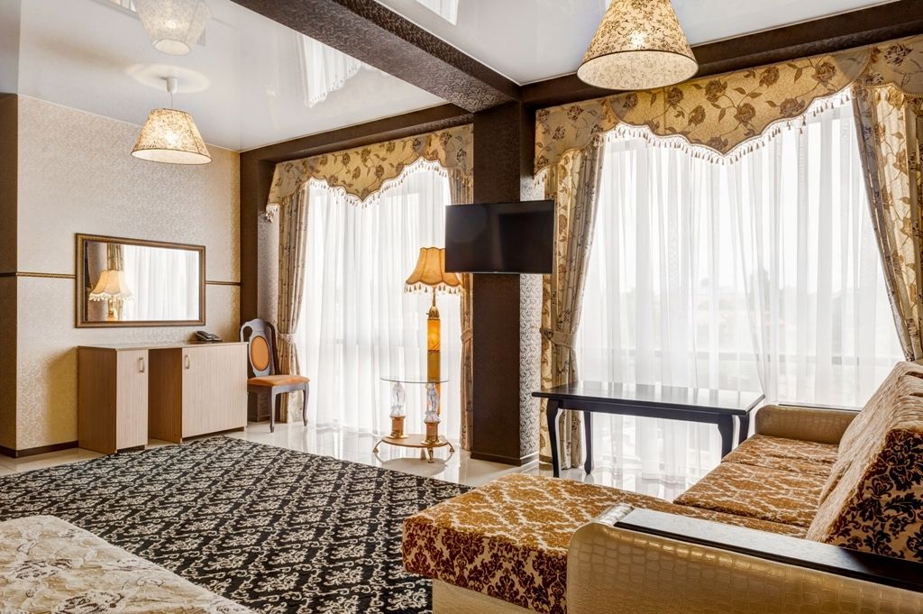 телевизор, кабельное телевидение, Wi-Fi, интернет, телефон, холодильник, кондиционер, светильник, настольные лампы, фен, обогреватель, ванная с джакузи, гидромассажная ванна, халаты, тапочки, гигиенические средства, двуспальная кровать, ортопедический матрас, диван, кресла, тумбы, стулья, шкаф для одежды, гардеробная, вешалки, журнальный столик, письменный стол, обеденный стол, зеркало, пуфики, ковер, звуконепроницаемые стены и окна, набор посуды, обслуживание номеров, минеральная вода, унитаз, раковина, косметическое зеркало, гостиная зона, ковровое покрытие, отопление, вид на город, кулер на этаже, плиточное покрытие, креслоВ гостиничном номере