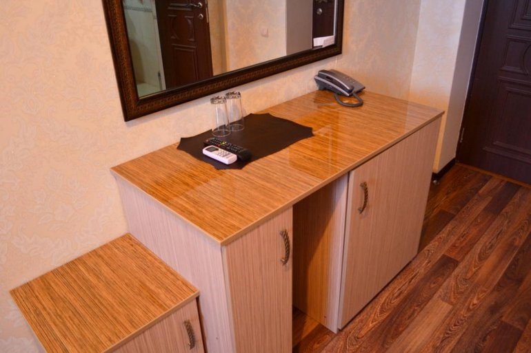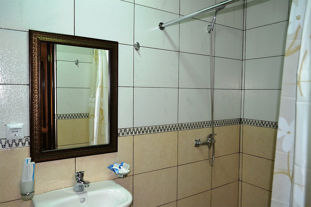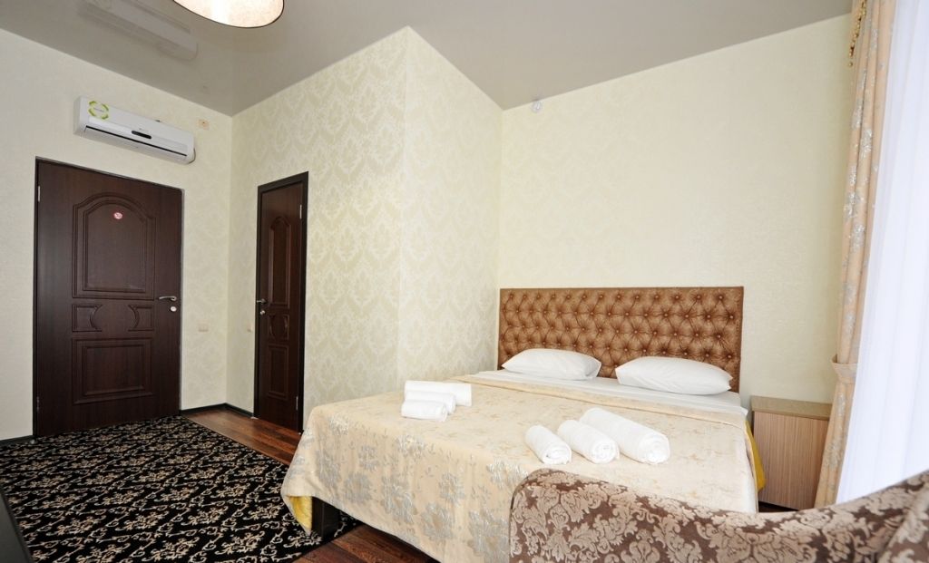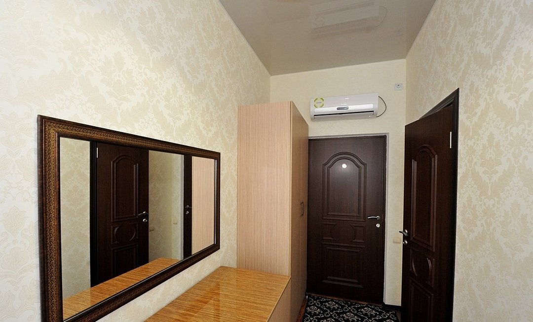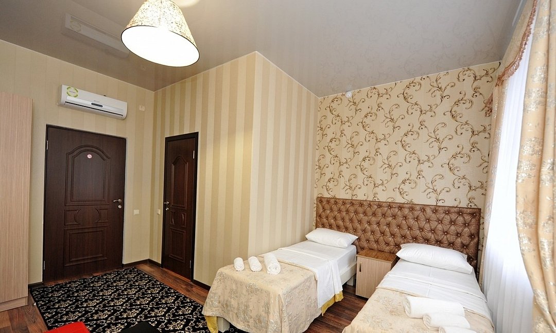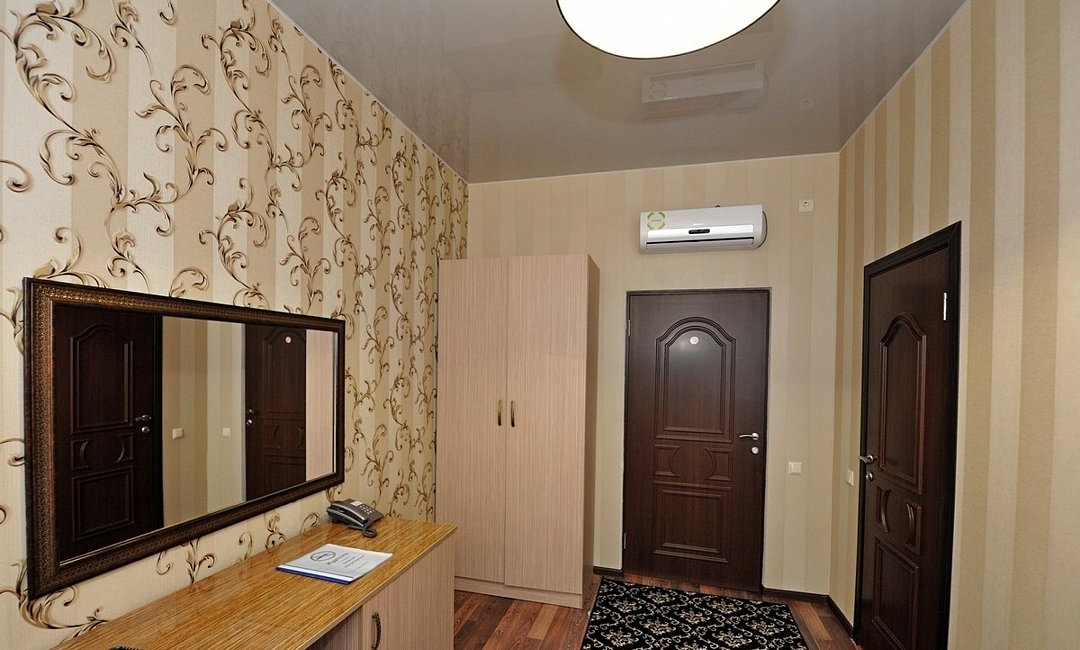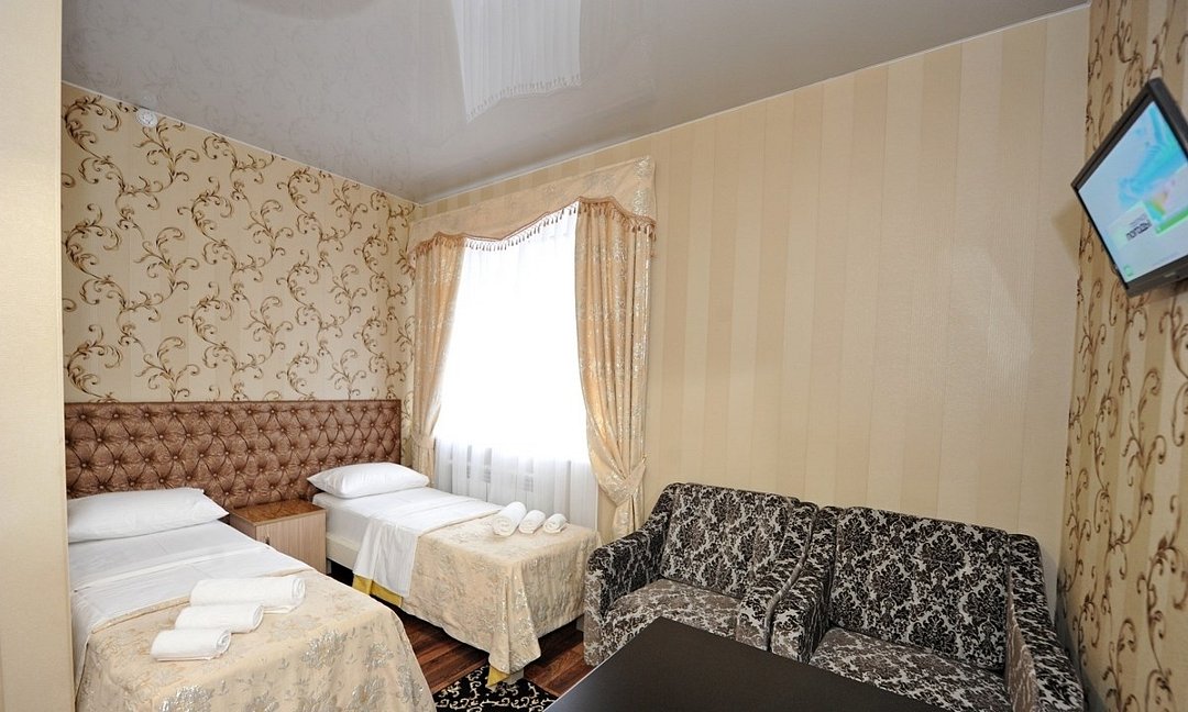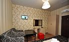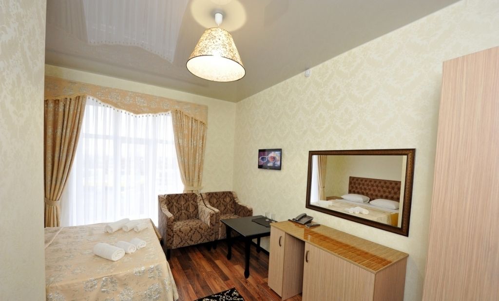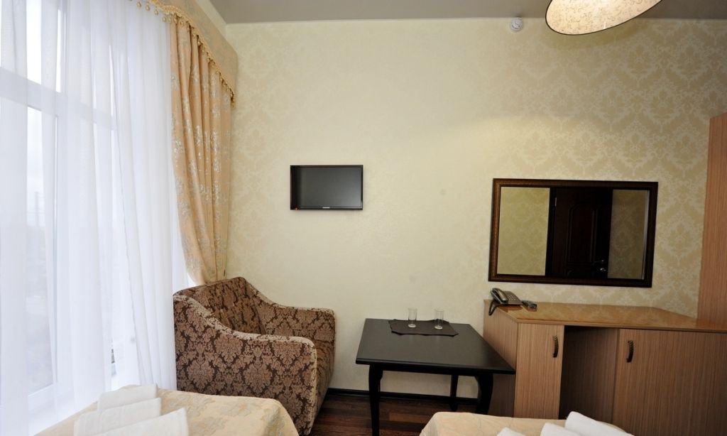 Небольшой уютный номер со всеми удобствами. Номер оснащен мебельным гарнитуром, телевизором, телефоном. Ванная комната оснащена душем, туалетом, раковиной, феном. Так же в ванной комнате есть необходимые принадлежности, такие как: мыло, шампунь, гель для душа, шапочка для душа, банное и лицевое полотенца.Услуги и удобства