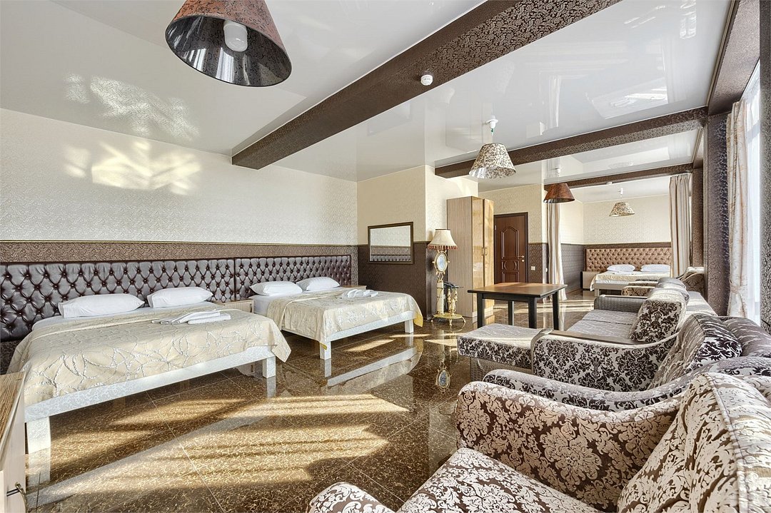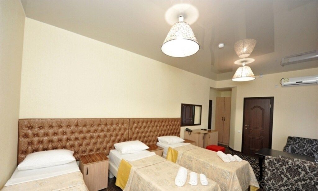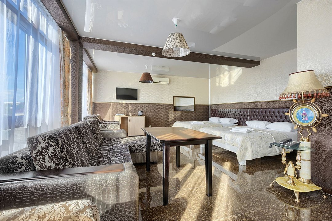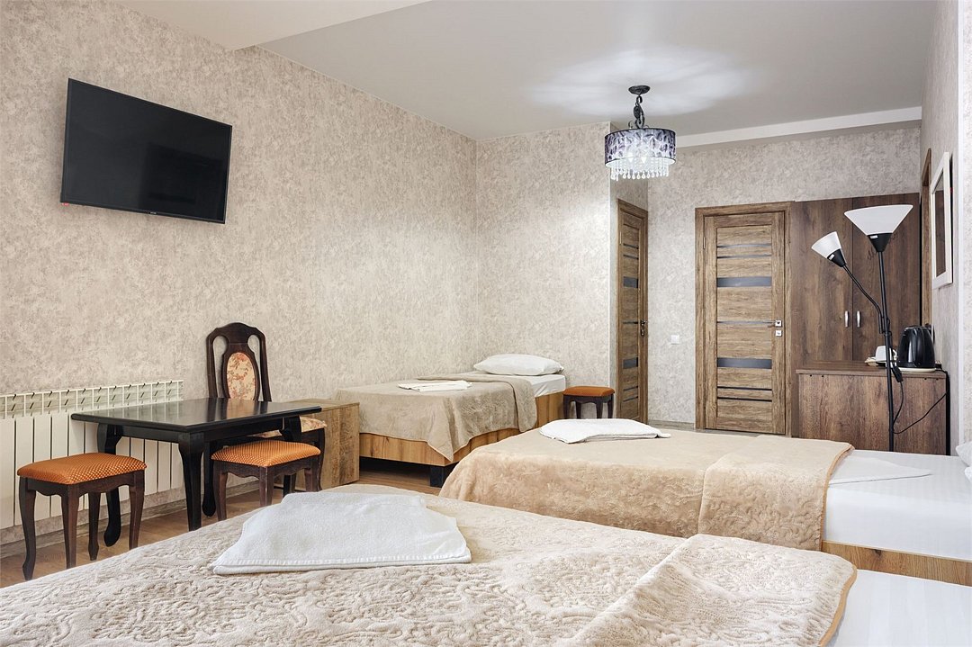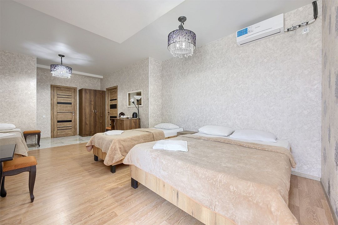 Чистый, светлый, просторный — наш семейный номер станет для вас идеальным домом на время отпуска с любимыми и близкими. Здесь есть большой двуспальный диван и две односпальные кровати, можно также добавить детскую кроватку. Пользуйтесь дополнительными удобствами: телевизором с плоским экраном, беспроводной интернет. Этот номер порадует всю вашу семью атмосферой тепла и уюта.Услуги и удобства